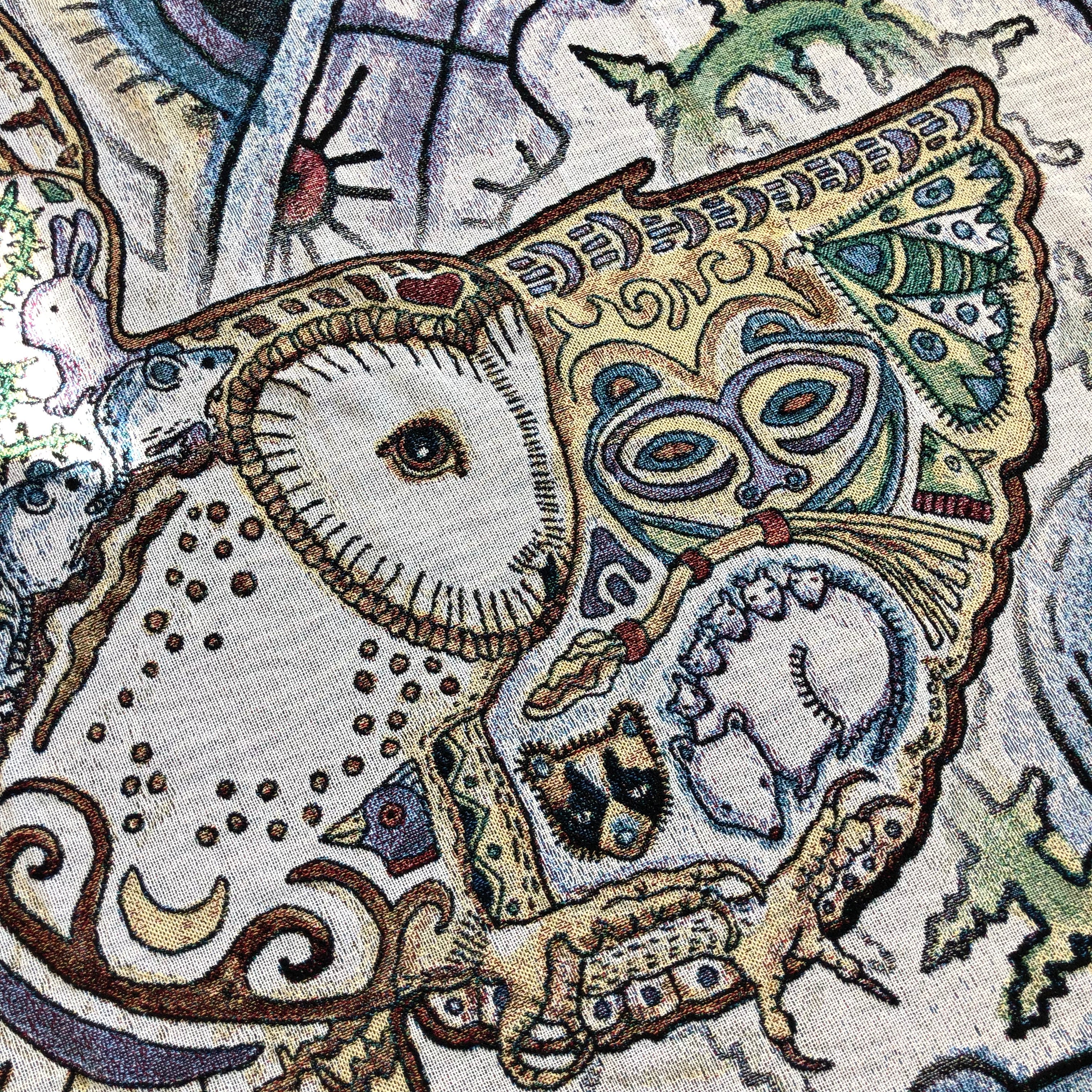Before every piece, she researches the animal: its habitat, what threatens its survival, the delicate ecosystem keeping it alive. Then, working from the center outward, she hand-draws the interconnectedness – hidden animals, weather patterns, environmental symbols woven throughout each intricate design.