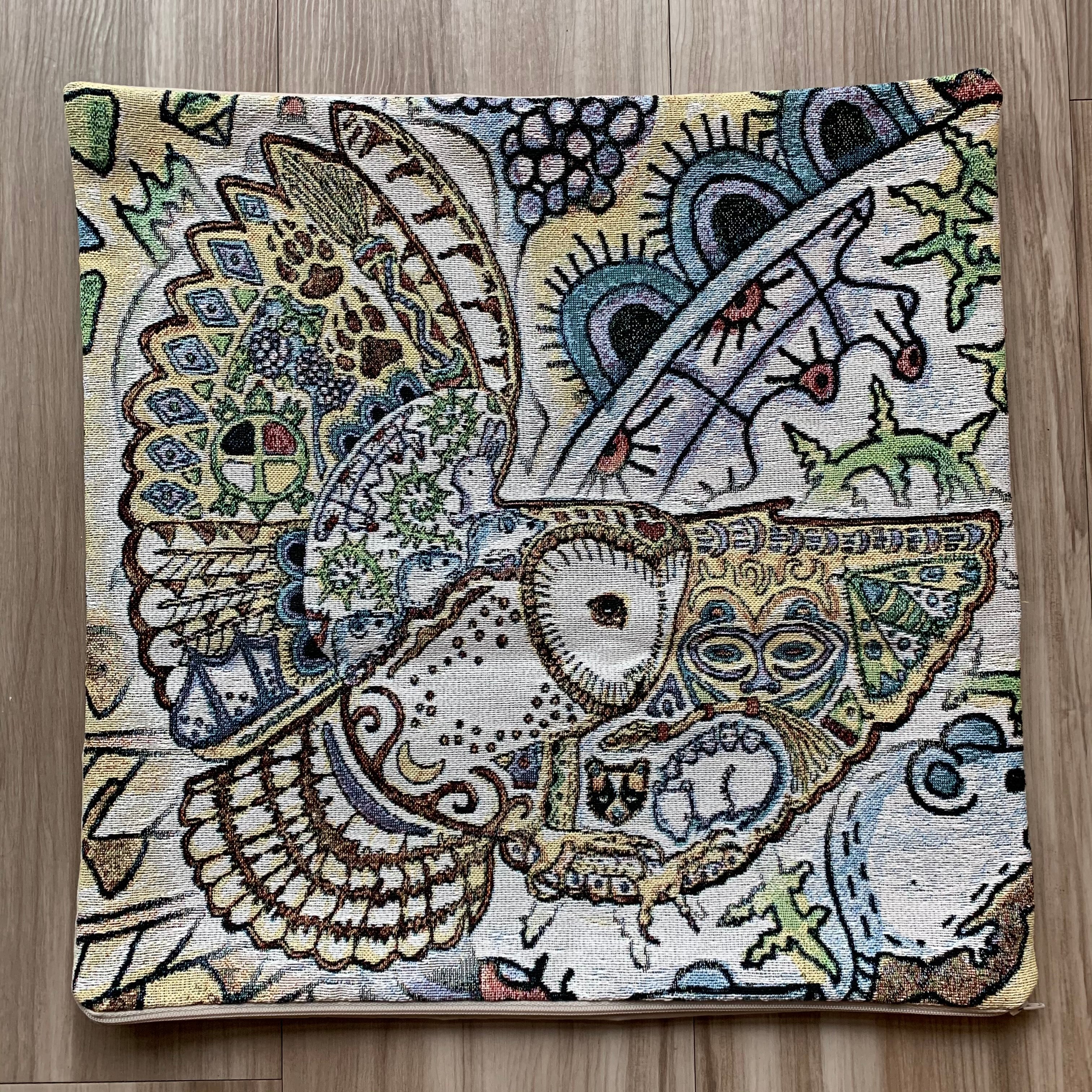 This pillow is 16 inches wide by 16 inches tall, and is woven from 100% cotton