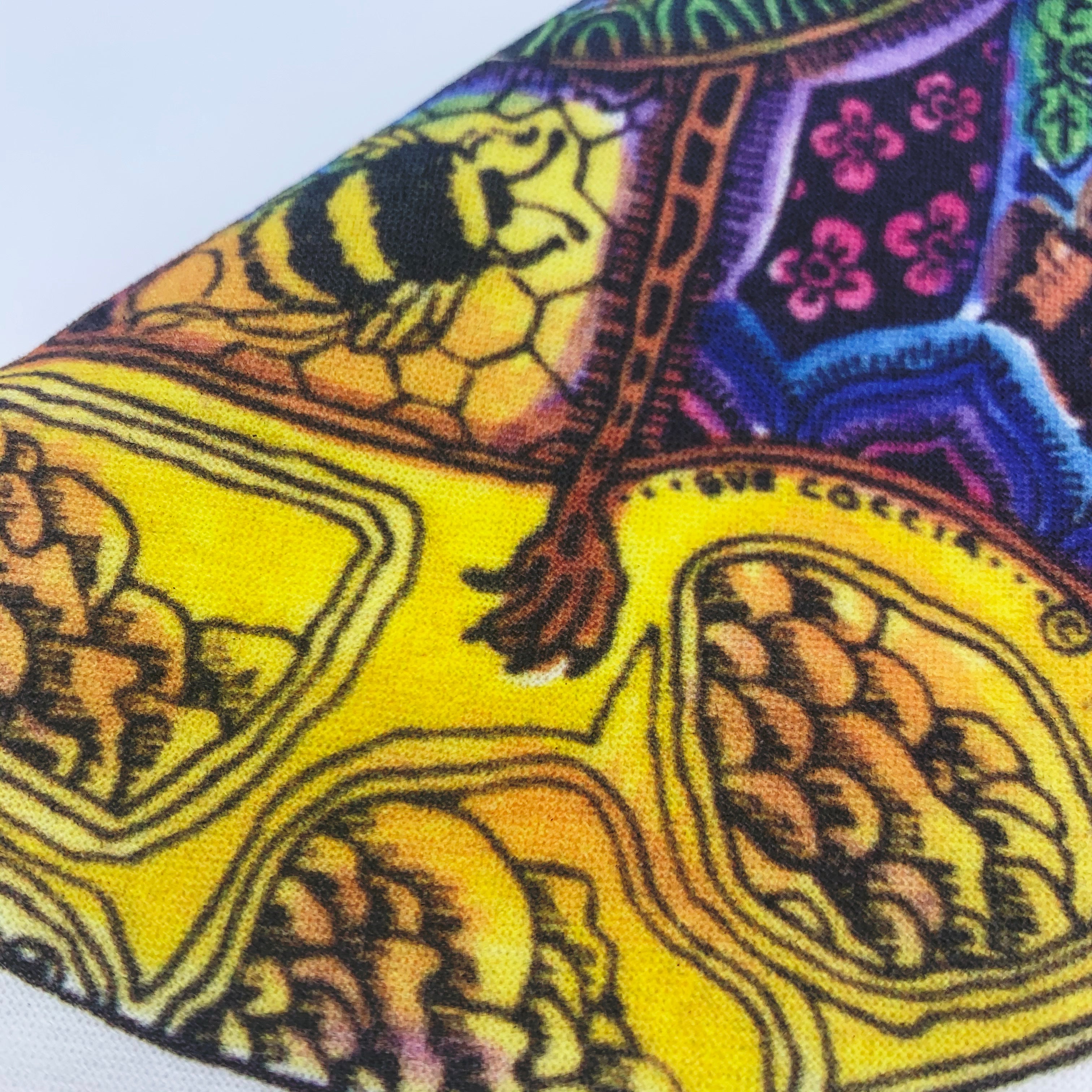 Before every piece, she researches the animal: its habitat, what threatens its survival, the delicate ecosystem keeping it alive. Then, working from the center outward, she hand-draws the interconnectedness – hidden animals, weather patterns, environmental symbols woven throughout each intricate design.