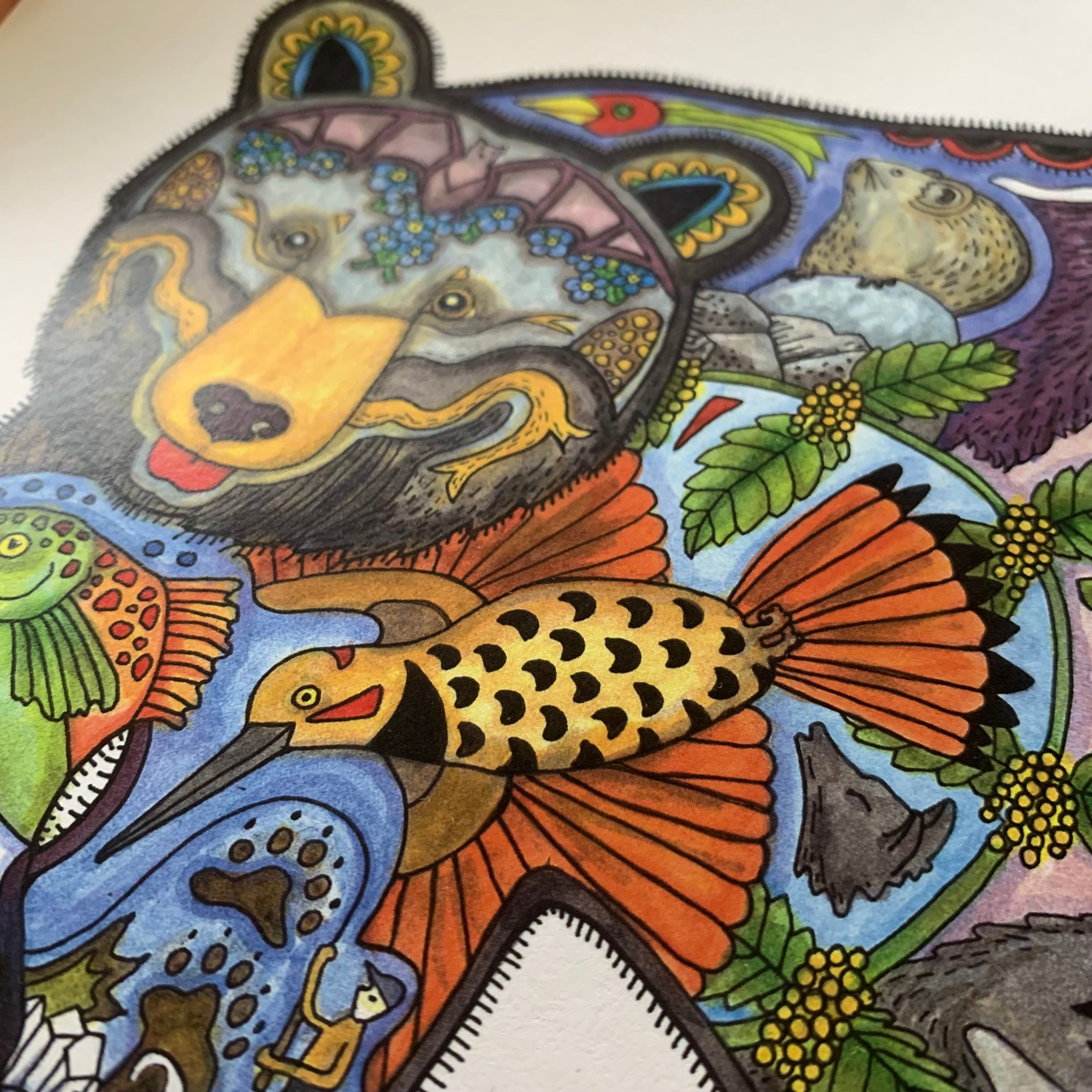 Before every piece, she researches the animal: its habitat, what threatens its survival, the delicate ecosystem keeping it alive. Then, working from the center outward, she hand-draws the interconnectedness – hidden animals, weather patterns, environmental symbols woven throughout each intricate design.