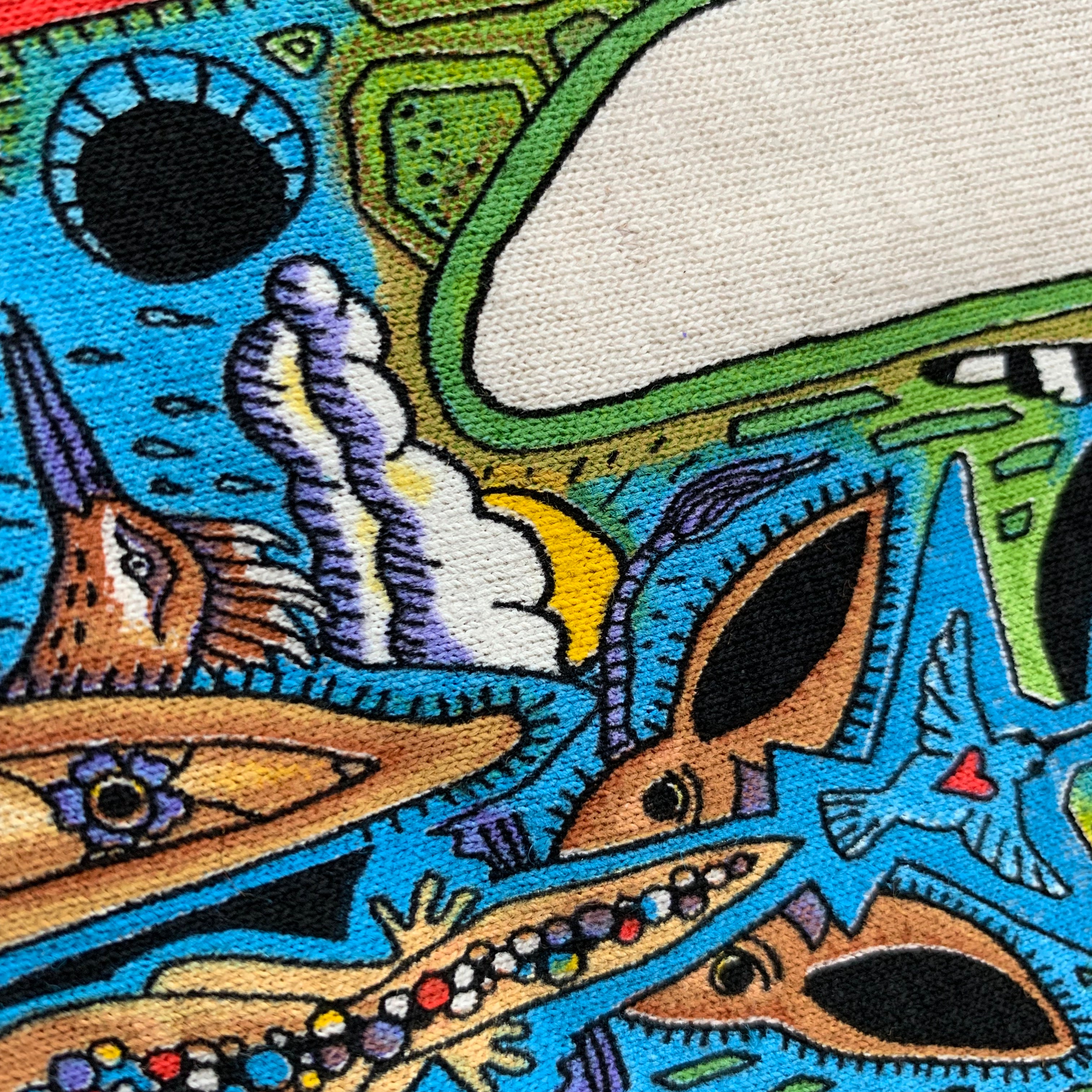 Before every piece, she researches the animal: its habitat, what threatens its survival, the delicate ecosystem keeping it alive. Then, working from the center outward, she hand-draws the interconnectedness – hidden animals, weather patterns, environmental symbols woven throughout each intricate design.