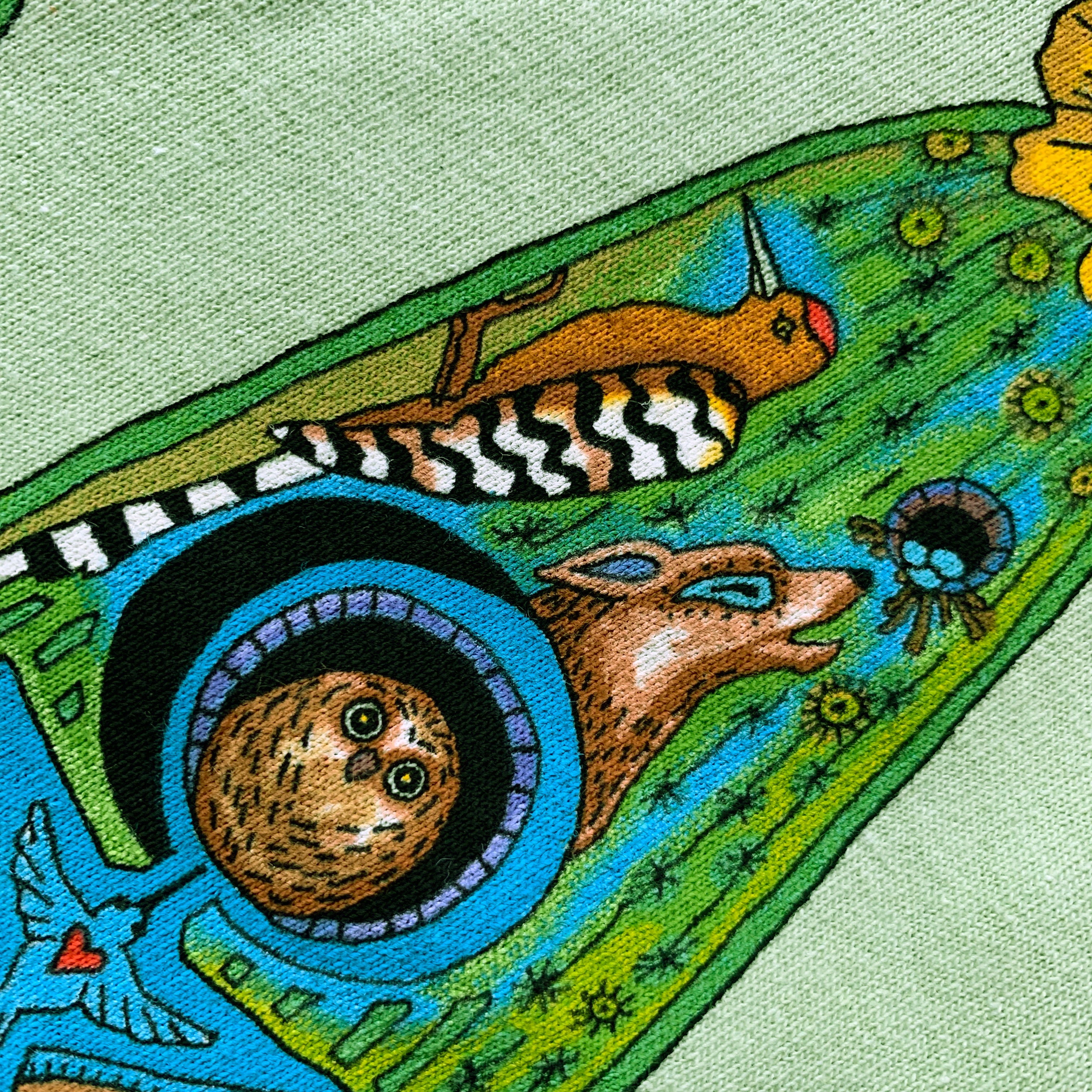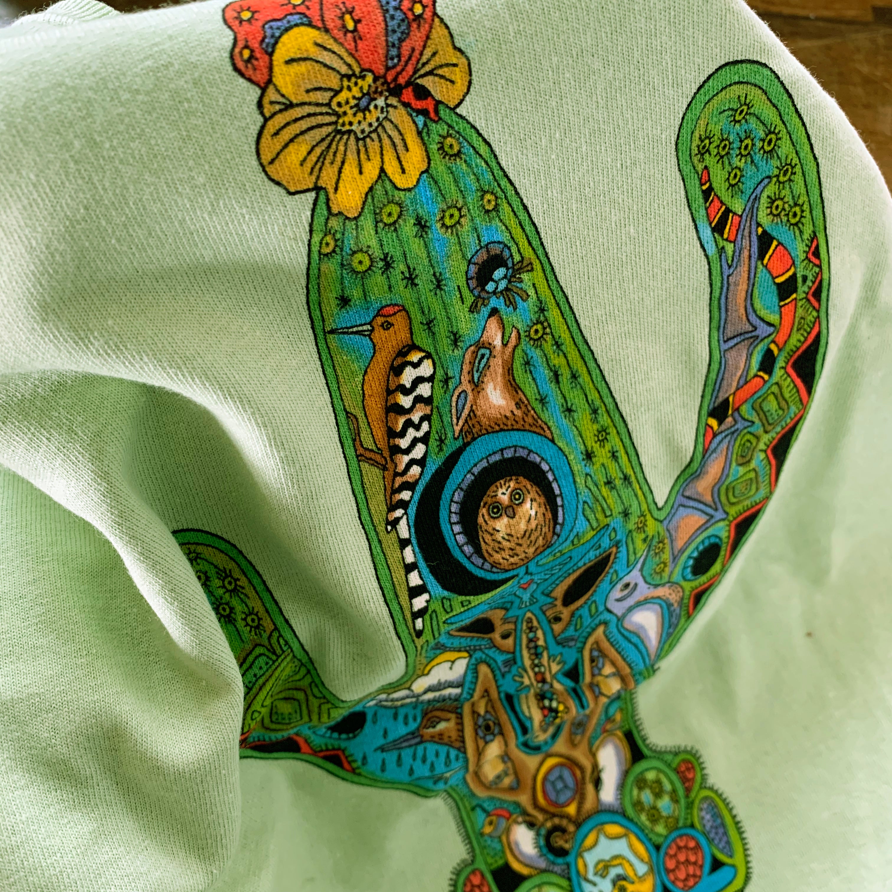 Before every piece, she researches the animal: its habitat, what threatens its survival, the delicate ecosystem keeping it alive. Then, working from the center outward, she hand-draws the interconnectedness – hidden animals, weather patterns, environmental symbols woven throughout each intricate design.