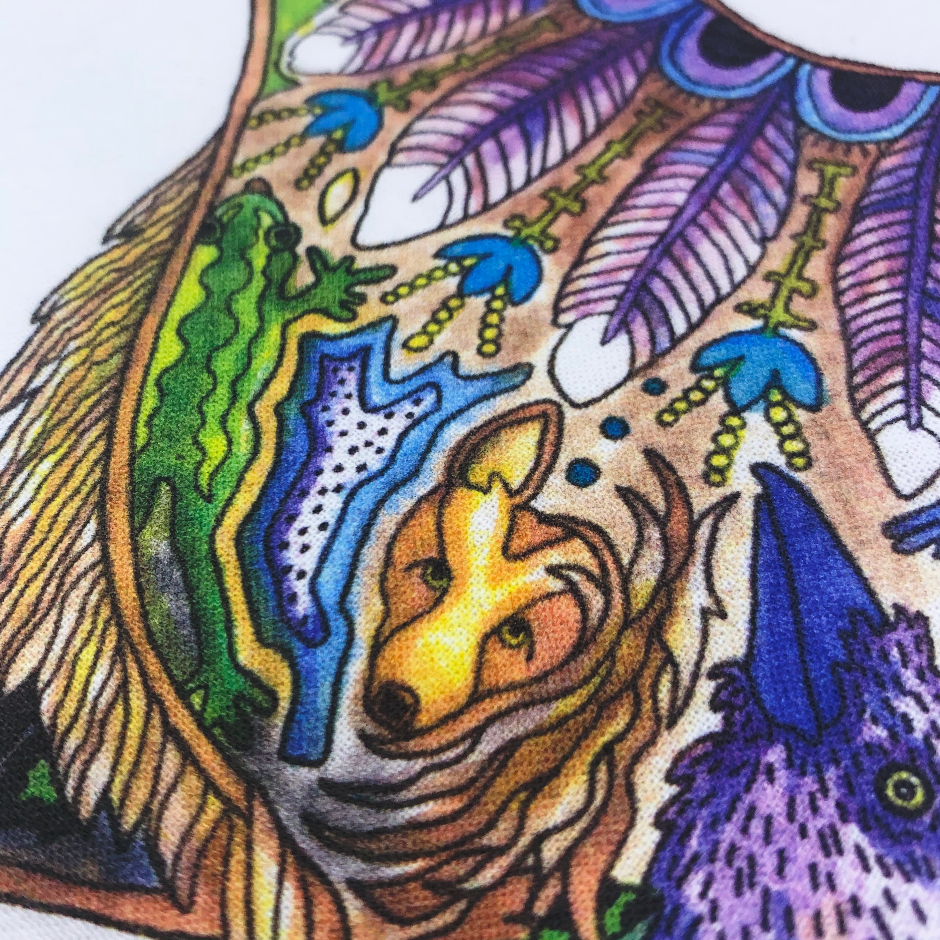 Before every piece, she researches the animal: its habitat, what threatens its survival, the delicate ecosystem keeping it alive. Then, working from the center outward, she hand-draws the interconnectedness – hidden animals, weather patterns, environmental symbols woven throughout each intricate design.