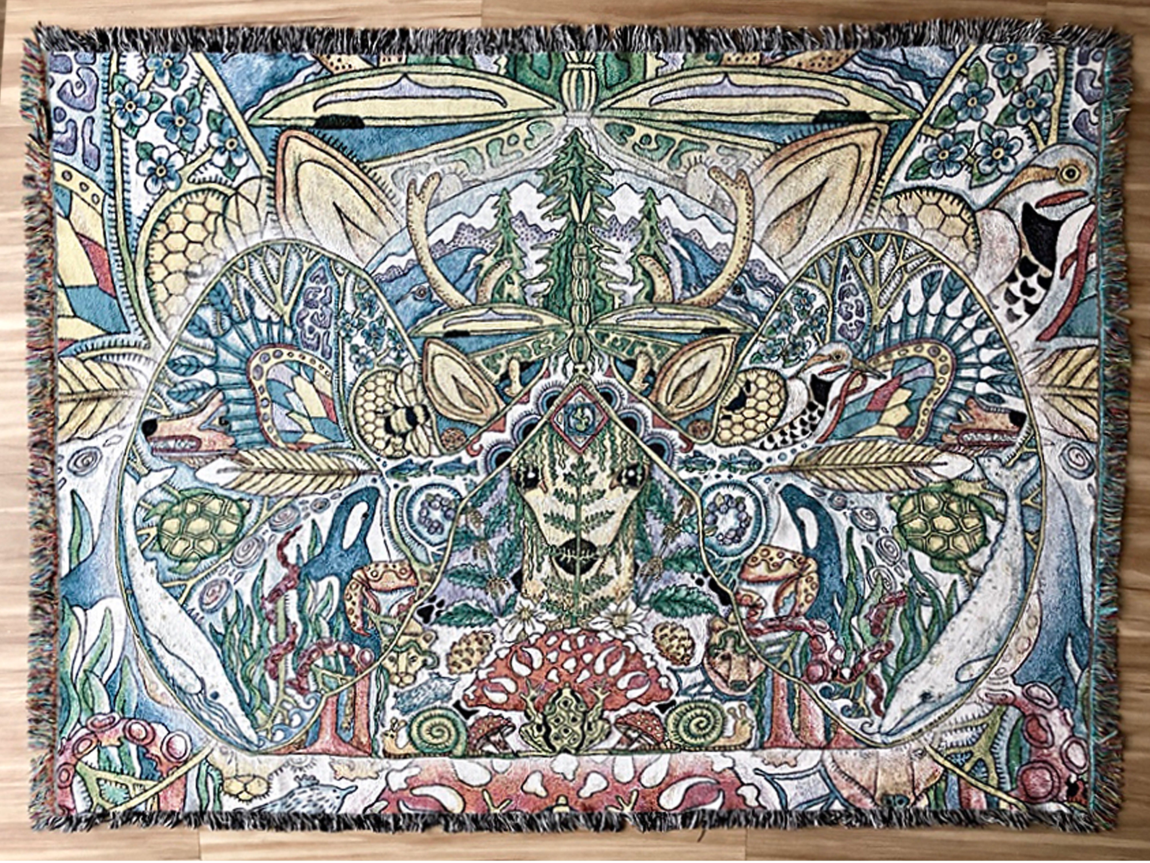 Before every piece, she researches the animal: its habitat, what threatens its survival, the delicate ecosystem keeping it alive. Then, working from the center outward, she hand-draws the interconnectedness – hidden animals, weather patterns, environmental symbols woven throughout each intricate design.