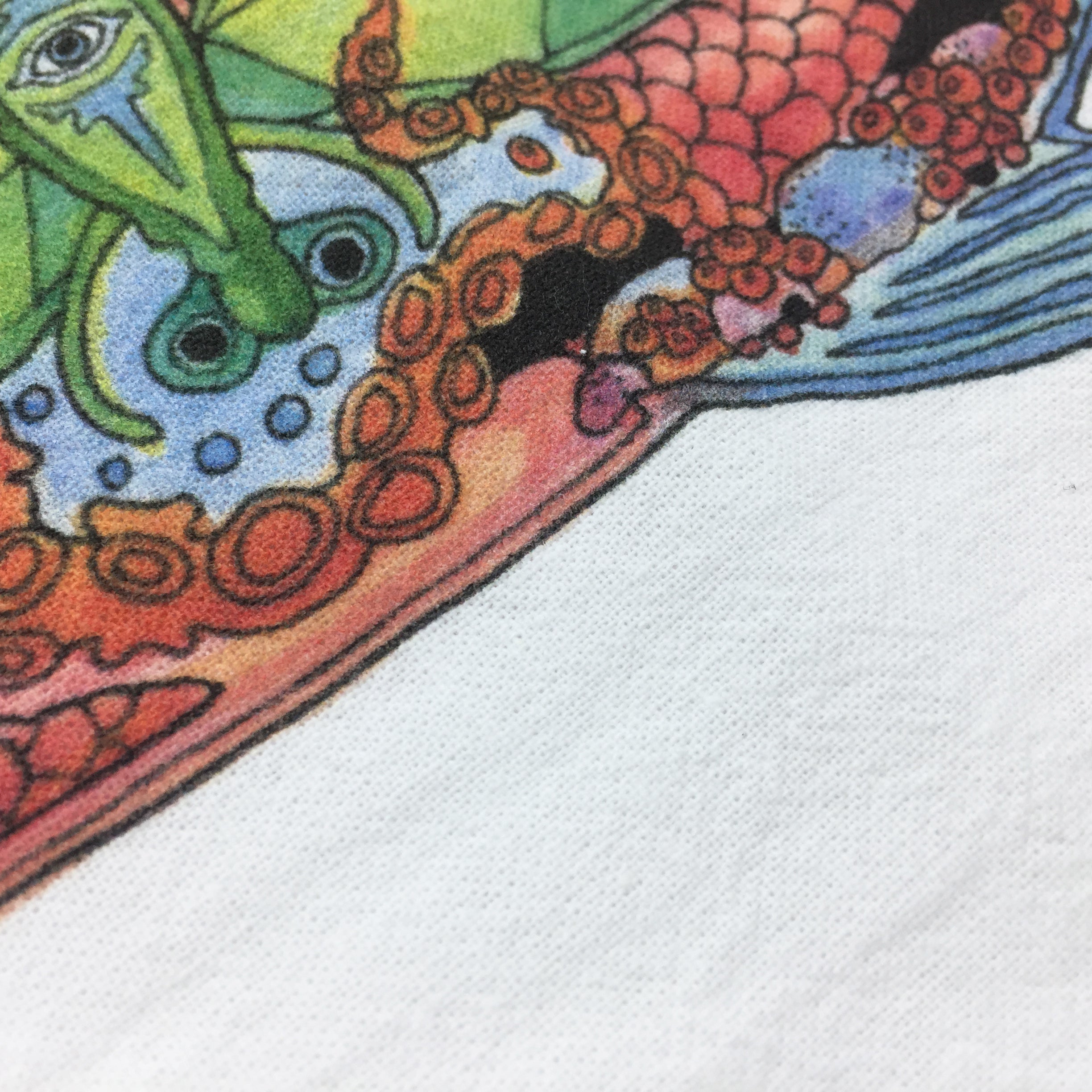 Before every piece, she researches the animal: its habitat, what threatens its survival, the delicate ecosystem keeping it alive. Then, working from the center outward, she hand-draws the interconnectedness – hidden animals, weather patterns, environmental symbols woven throughout each intricate design.