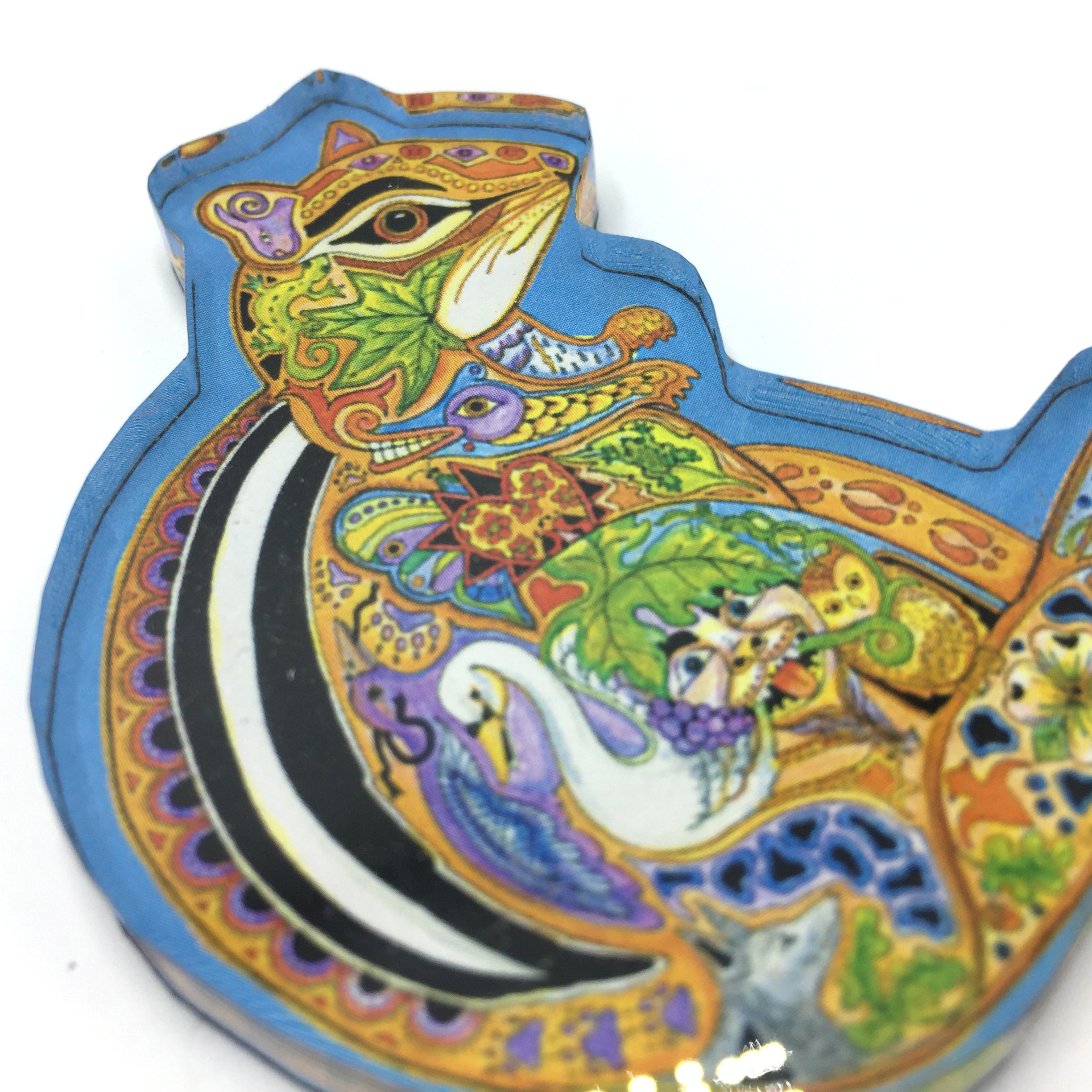 Before every piece, she researches the animal: its habitat, what threatens its survival, the delicate ecosystem keeping it alive. Then, working from the center outward, she hand-draws the interconnectedness – hidden animals, weather patterns, environmental symbols woven throughout each intricate design.