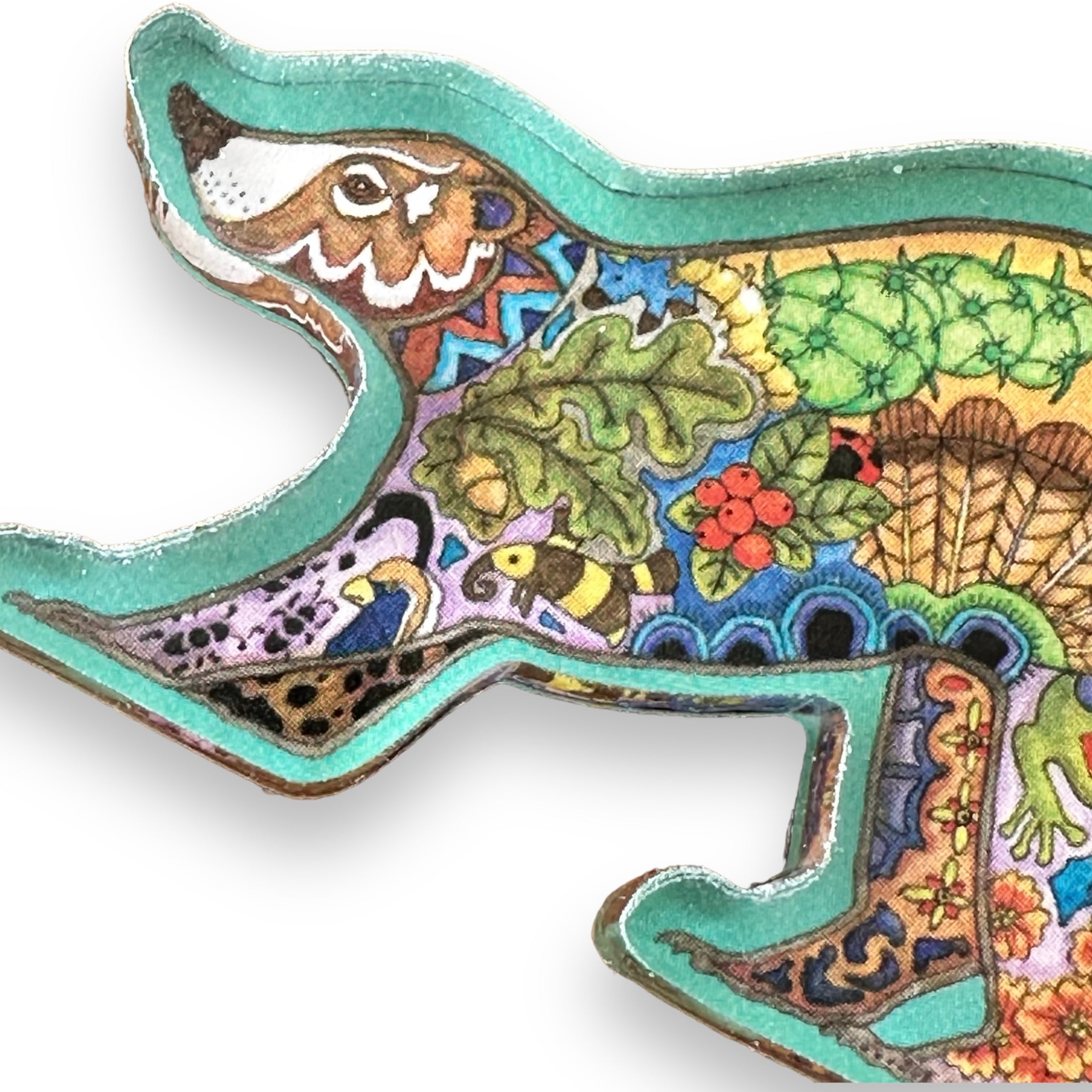 Before every piece, she researches the animal: its habitat, what threatens its survival, the delicate ecosystem keeping it alive. Then, working from the center outward, she hand-draws the interconnectedness – hidden animals, weather patterns, environmental symbols woven throughout each intricate design.