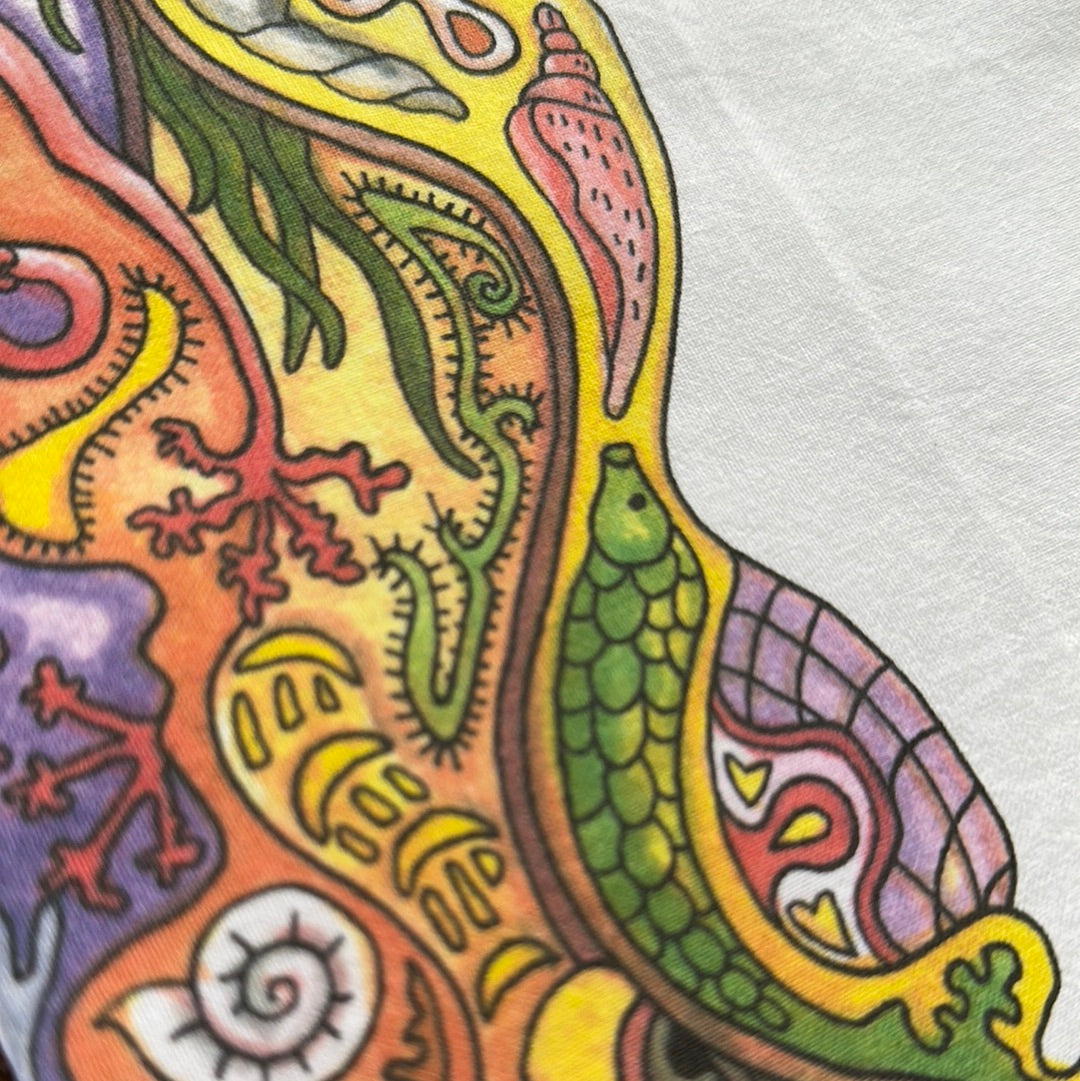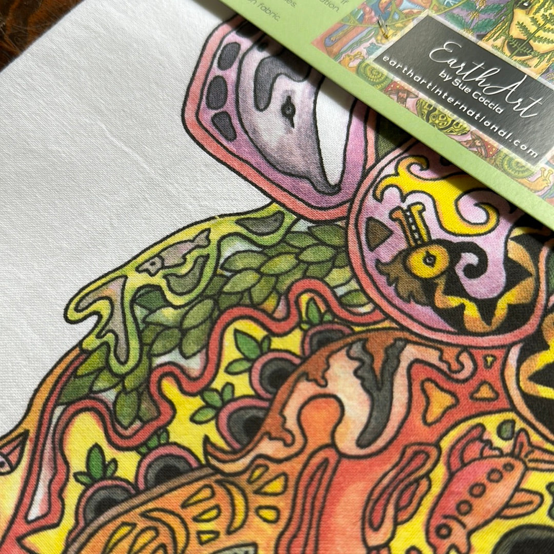 Before every piece, she researches the animal: its habitat, what threatens its survival, the delicate ecosystem keeping it alive. Then, working from the center outward, she hand-draws the interconnectedness – hidden animals, weather patterns, environmental symbols woven throughout each intricate design.