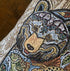 Before every piece, she researches the animal: its habitat, what threatens its survival, the delicate ecosystem keeping it alive. Then, working from the center outward, she hand-draws the interconnectedness – hidden animals, weather patterns, environmental symbols woven throughout each intricate design.