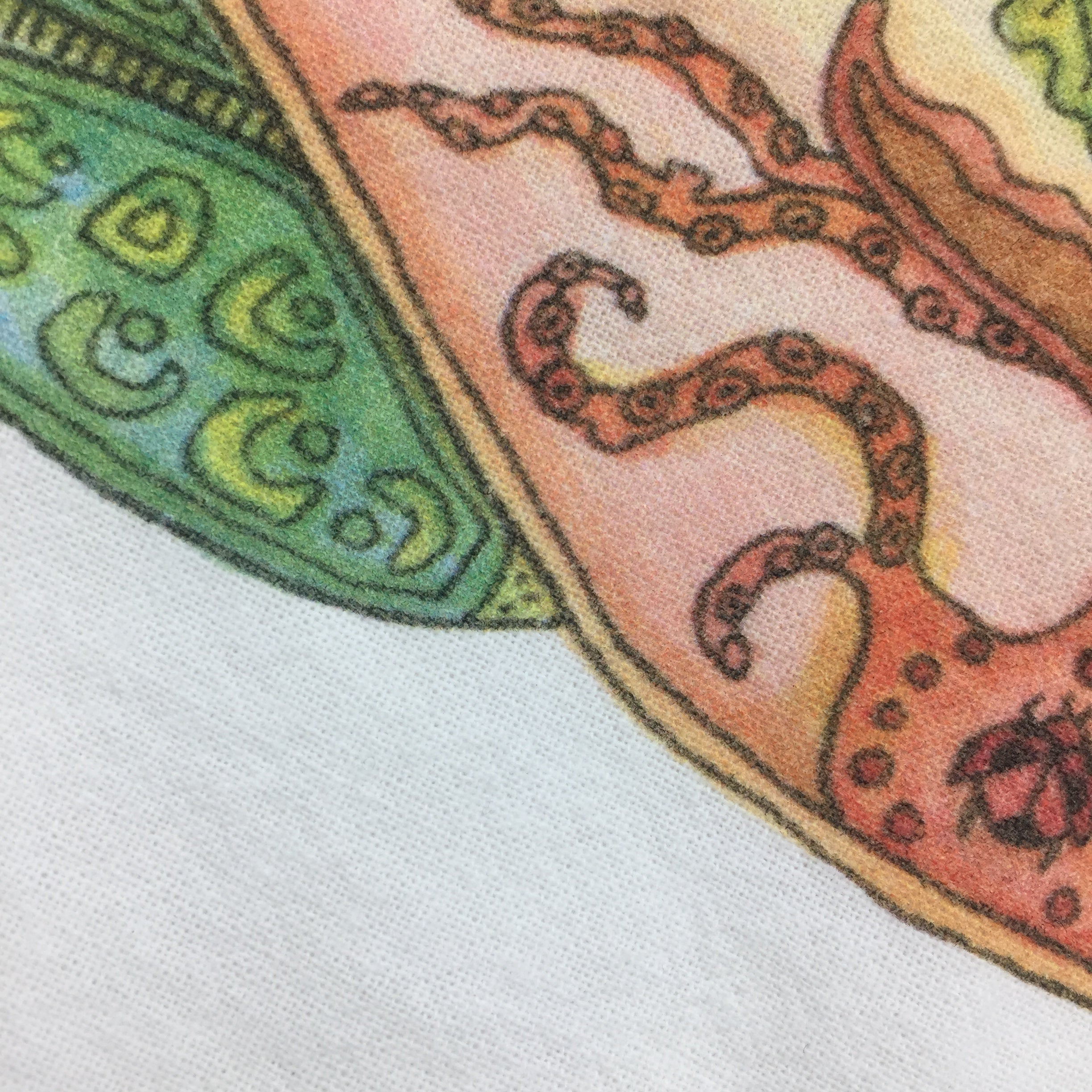 Before every piece, she researches the animal: its habitat, what threatens its survival, the delicate ecosystem keeping it alive. Then, working from the center outward, she hand-draws the interconnectedness – hidden animals, weather patterns, environmental symbols woven throughout each intricate design.