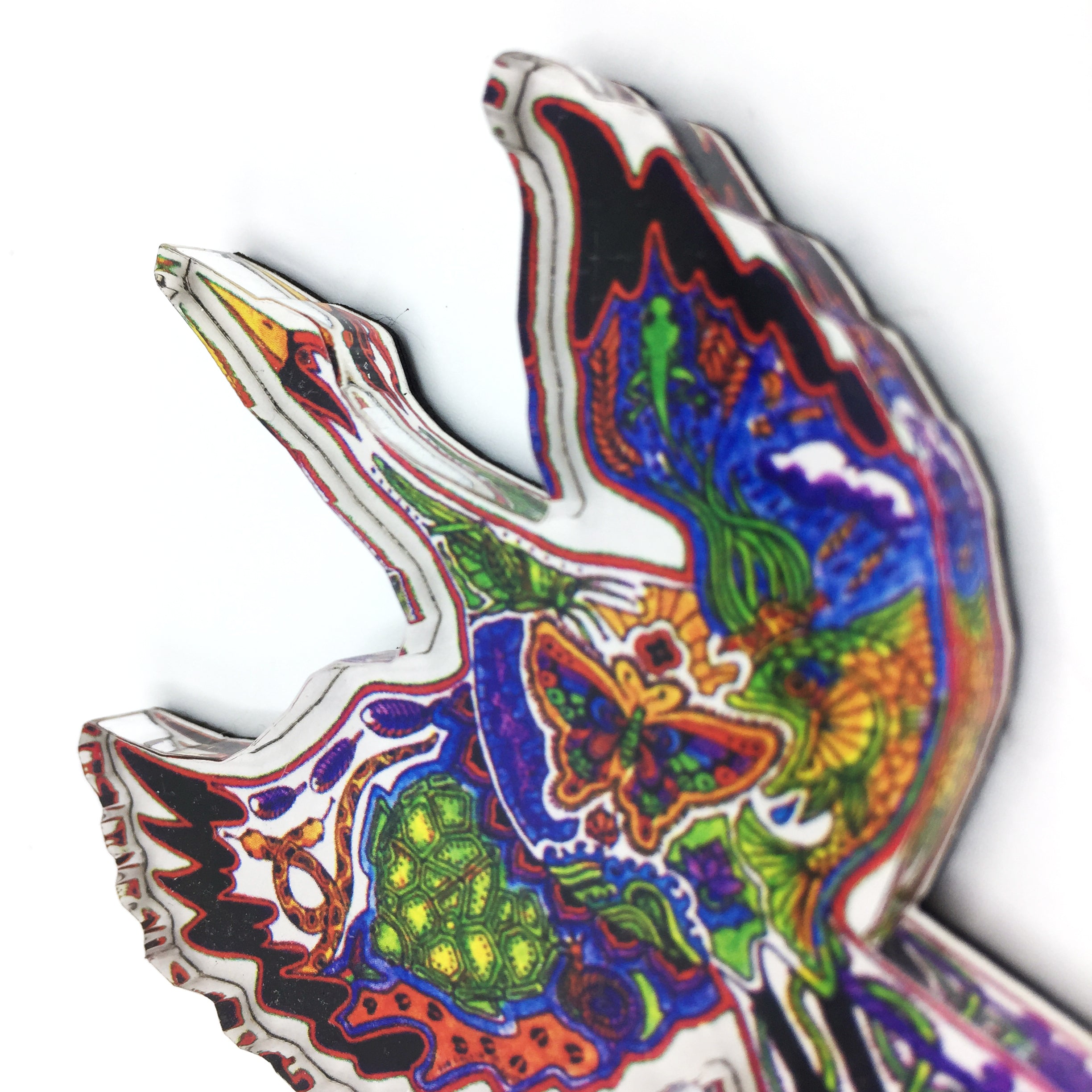 Before every piece, she researches the animal: its habitat, what threatens its survival, the delicate ecosystem keeping it alive. Then, working from the center outward, she hand-draws the interconnectedness – hidden animals, weather patterns, environmental symbols woven throughout each intricate design.