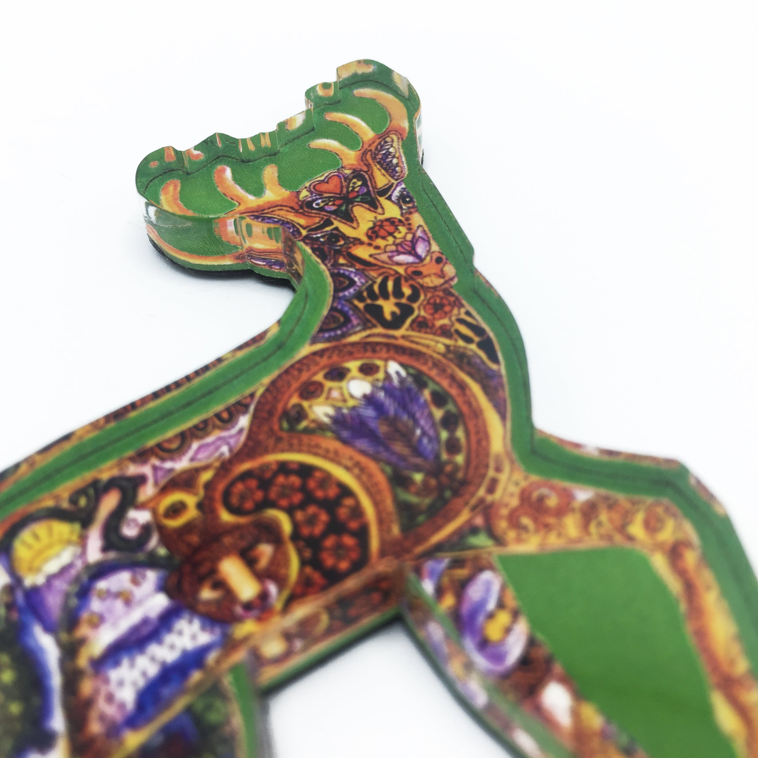 Before every piece, she researches the animal: its habitat, what threatens its survival, the delicate ecosystem keeping it alive. Then, working from the center outward, she hand-draws the interconnectedness – hidden animals, weather patterns, environmental symbols woven throughout each intricate design.