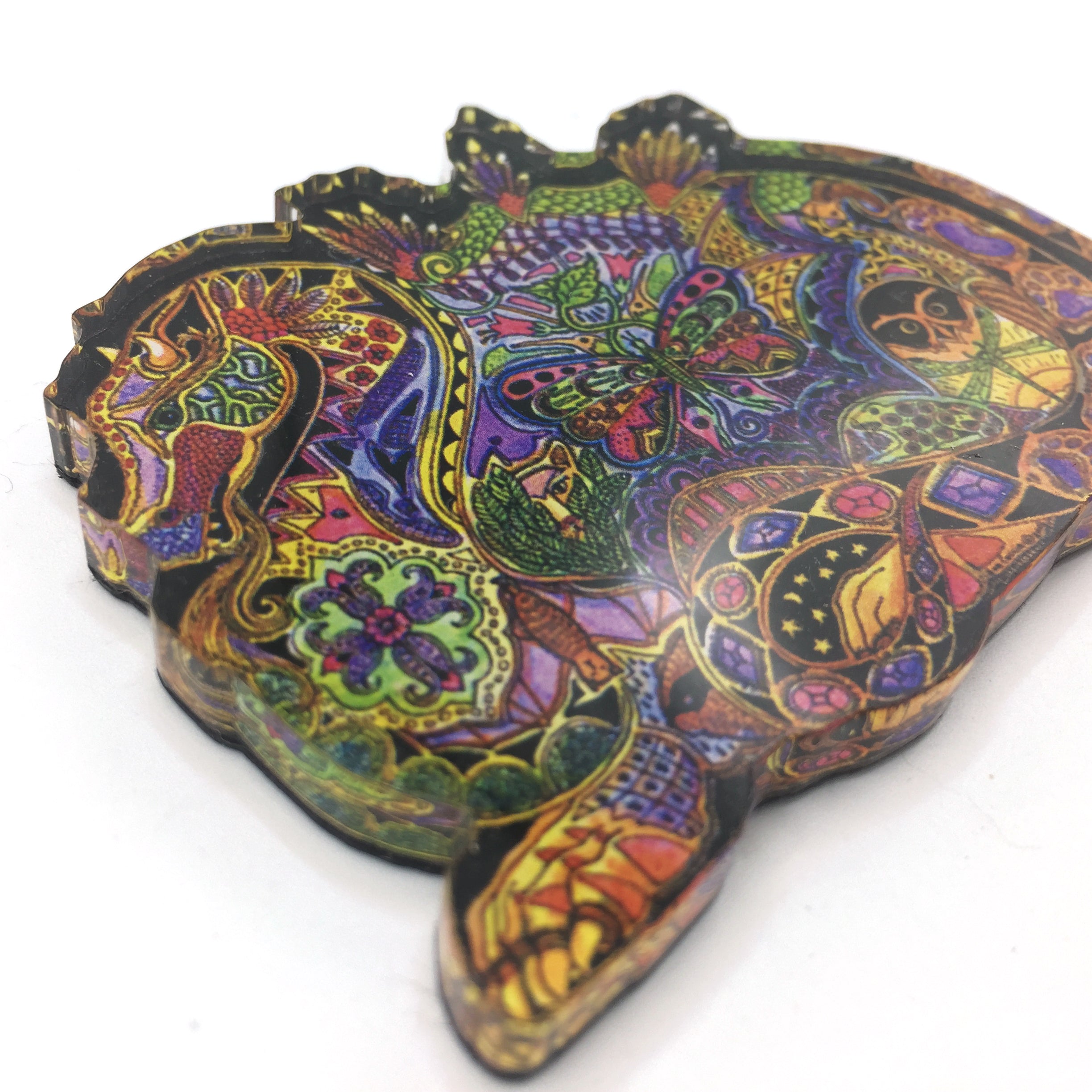 Before every piece, she researches the animal: its habitat, what threatens its survival, the delicate ecosystem keeping it alive. Then, working from the center outward, she hand-draws the interconnectedness – hidden animals, weather patterns, environmental symbols woven throughout each intricate design.