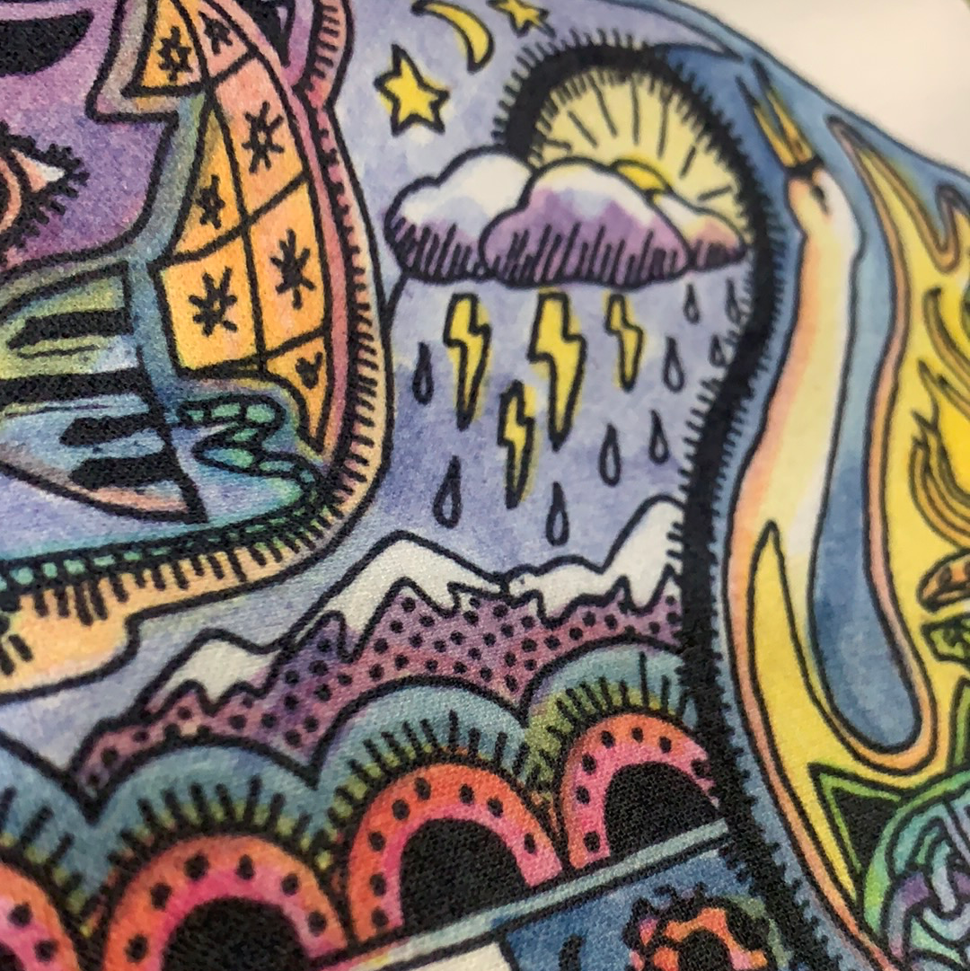 Before every piece, she researches the animal: its habitat, what threatens its survival, the delicate ecosystem keeping it alive. Then, working from the center outward, she hand-draws the interconnectedness – hidden animals, weather patterns, environmental symbols woven throughout each intricate design.