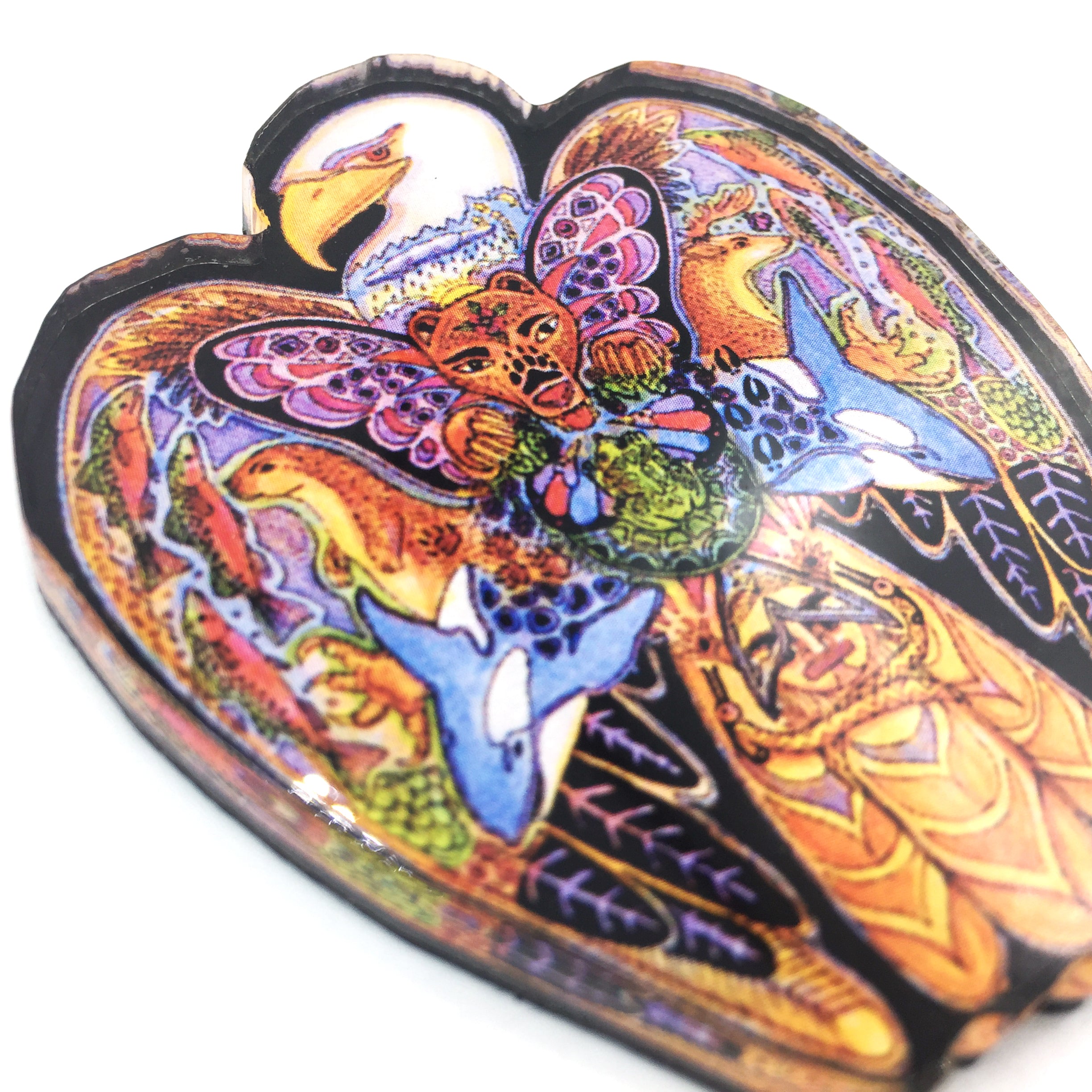 Before every piece, she researches the animal: its habitat, what threatens its survival, the delicate ecosystem keeping it alive. Then, working from the center outward, she hand-draws the interconnectedness – hidden animals, weather patterns, environmental symbols woven throughout each intricate design.