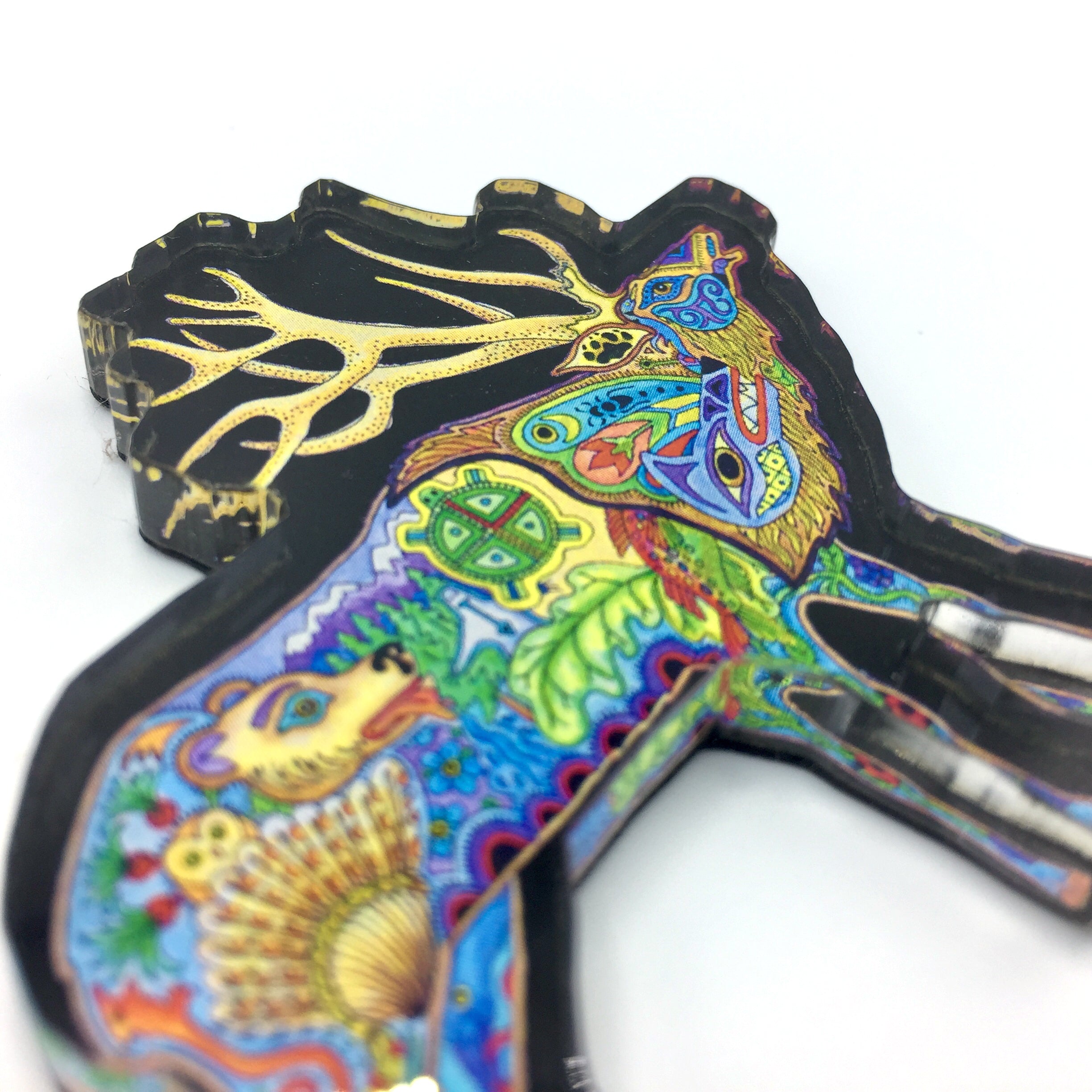 Before every piece, she researches the animal: its habitat, what threatens its survival, the delicate ecosystem keeping it alive. Then, working from the center outward, she hand-draws the interconnectedness – hidden animals, weather patterns, environmental symbols woven throughout each intricate design.