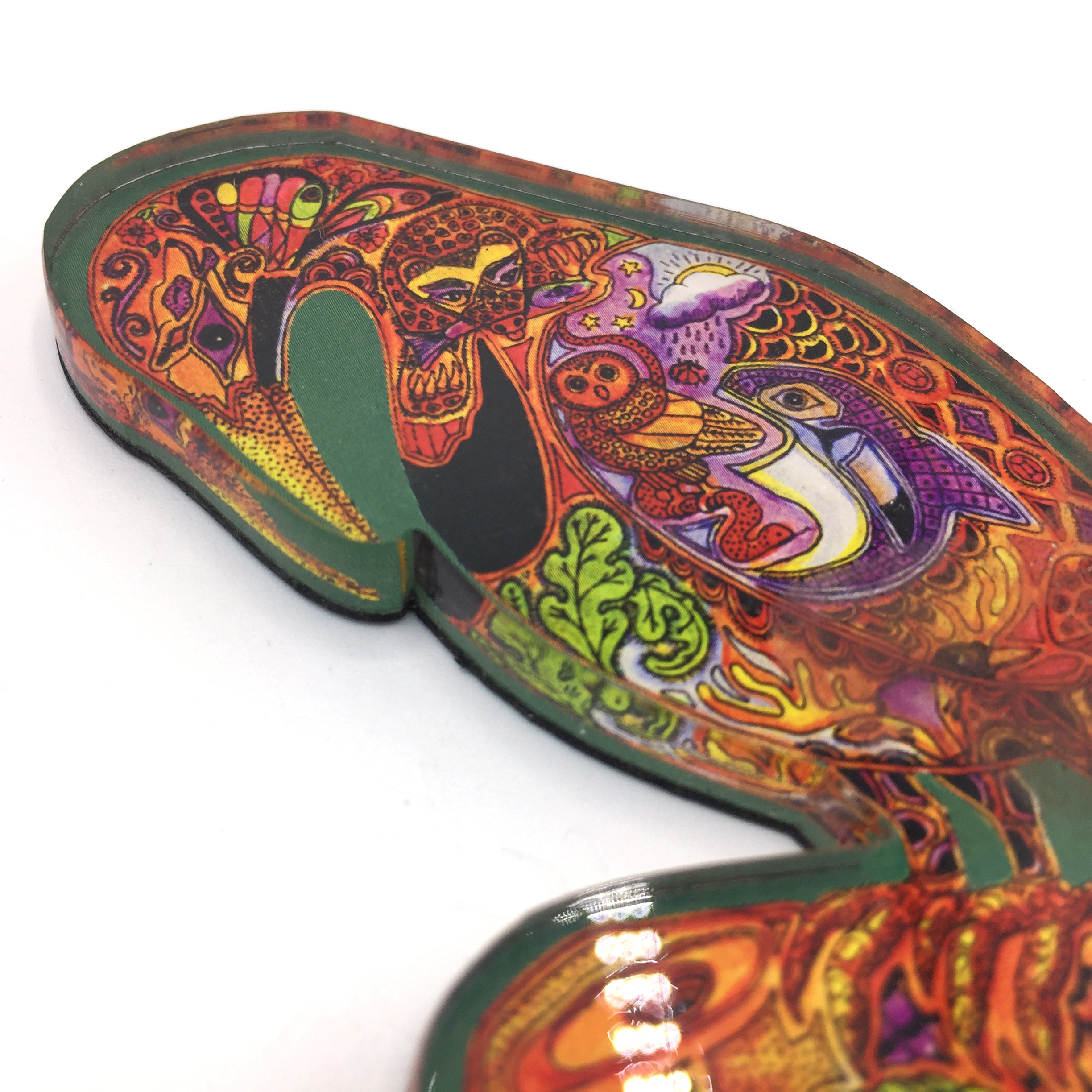 Before every piece, she researches the animal: its habitat, what threatens its survival, the delicate ecosystem keeping it alive. Then, working from the center outward, she hand-draws the interconnectedness – hidden animals, weather patterns, environmental symbols woven throughout each intricate design.