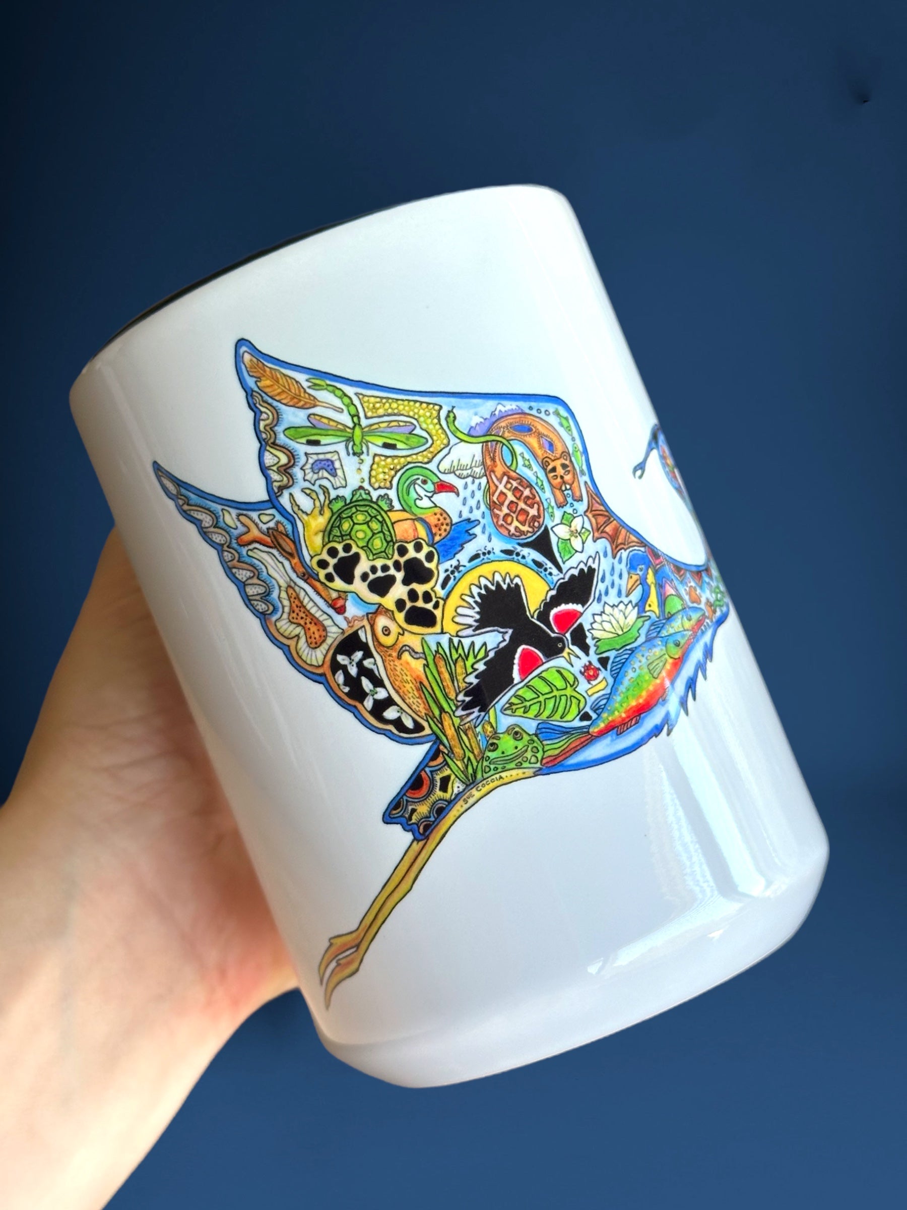 Before every piece, she researches the animal: its habitat, what threatens its survival, the delicate ecosystem keeping it alive. Then, working from the center outward, she hand-draws the interconnectedness – hidden animals, weather patterns, environmental symbols woven throughout each intricate design.