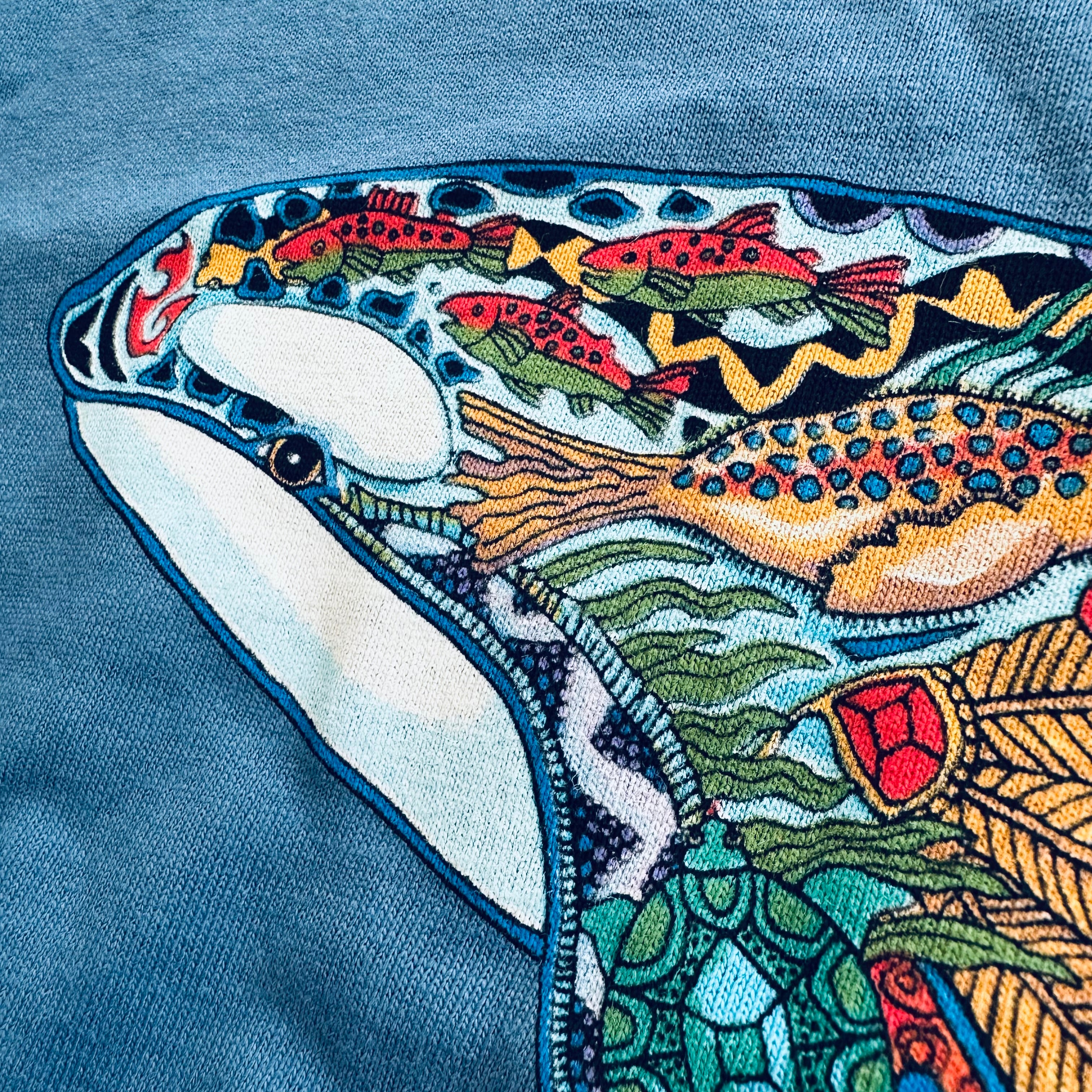 Before every piece, she researches the animal: its habitat, what threatens its survival, the delicate ecosystem keeping it alive. Then, working from the center outward, she hand-draws the interconnectedness – hidden animals, weather patterns, environmental symbols woven throughout each intricate design.