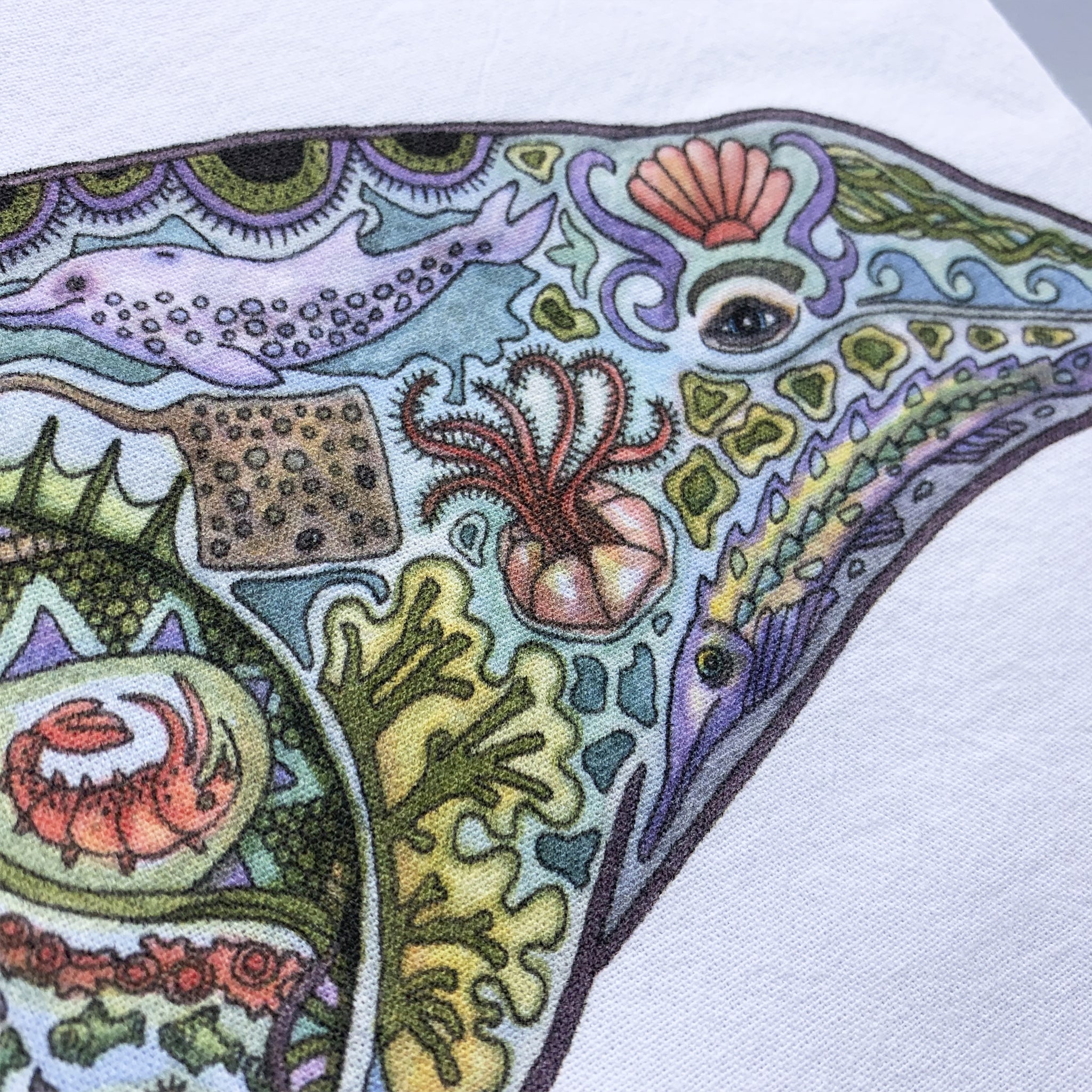 Before every piece, she researches the animal: its habitat, what threatens its survival, the delicate ecosystem keeping it alive. Then, working from the center outward, she hand-draws the interconnectedness – hidden animals, weather patterns, environmental symbols woven throughout each intricate design.