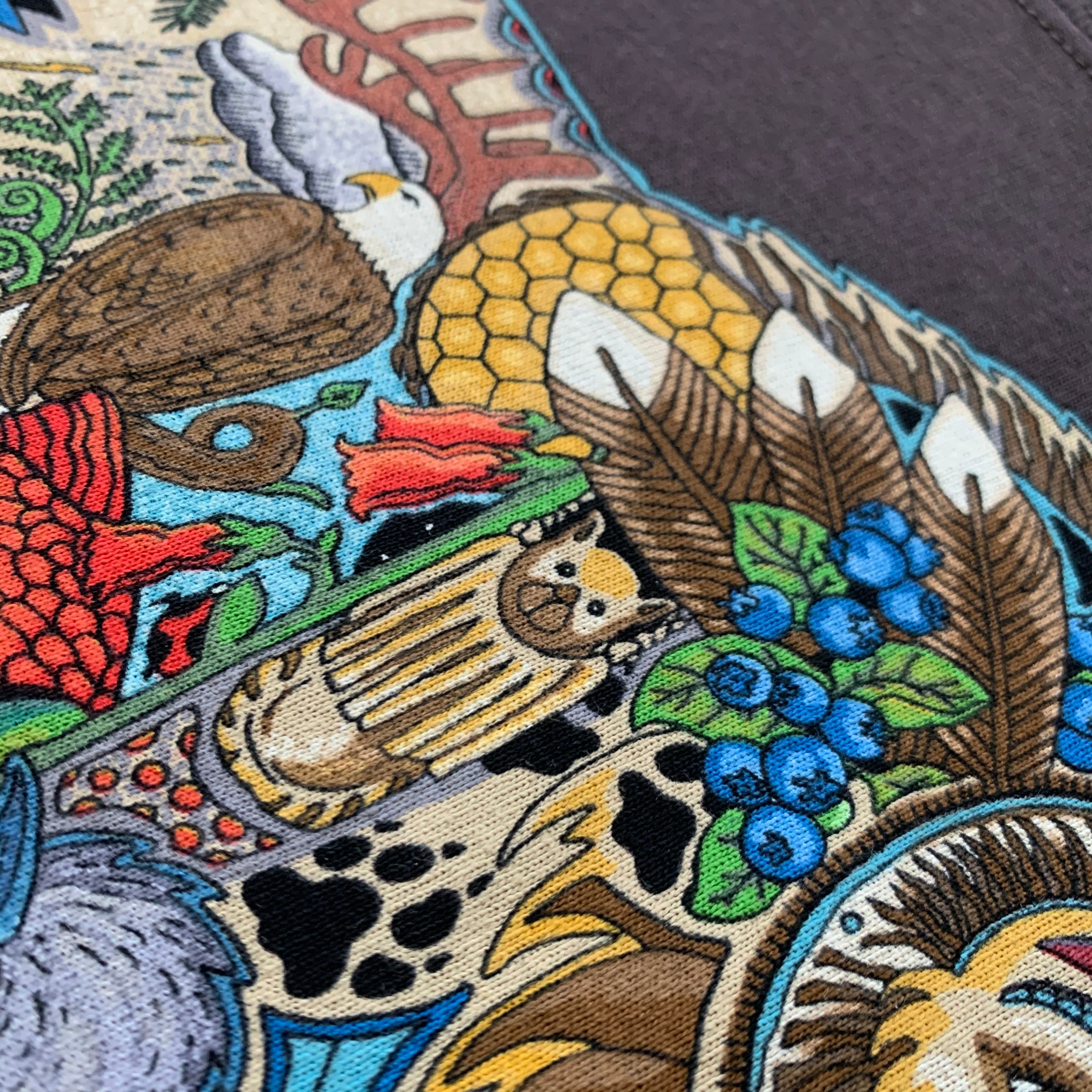 Before every piece, she researches the animal: its habitat, what threatens its survival, the delicate ecosystem keeping it alive. Then, working from the center outward, she hand-draws the interconnectedness – hidden animals, weather patterns, environmental symbols woven throughout each intricate design.