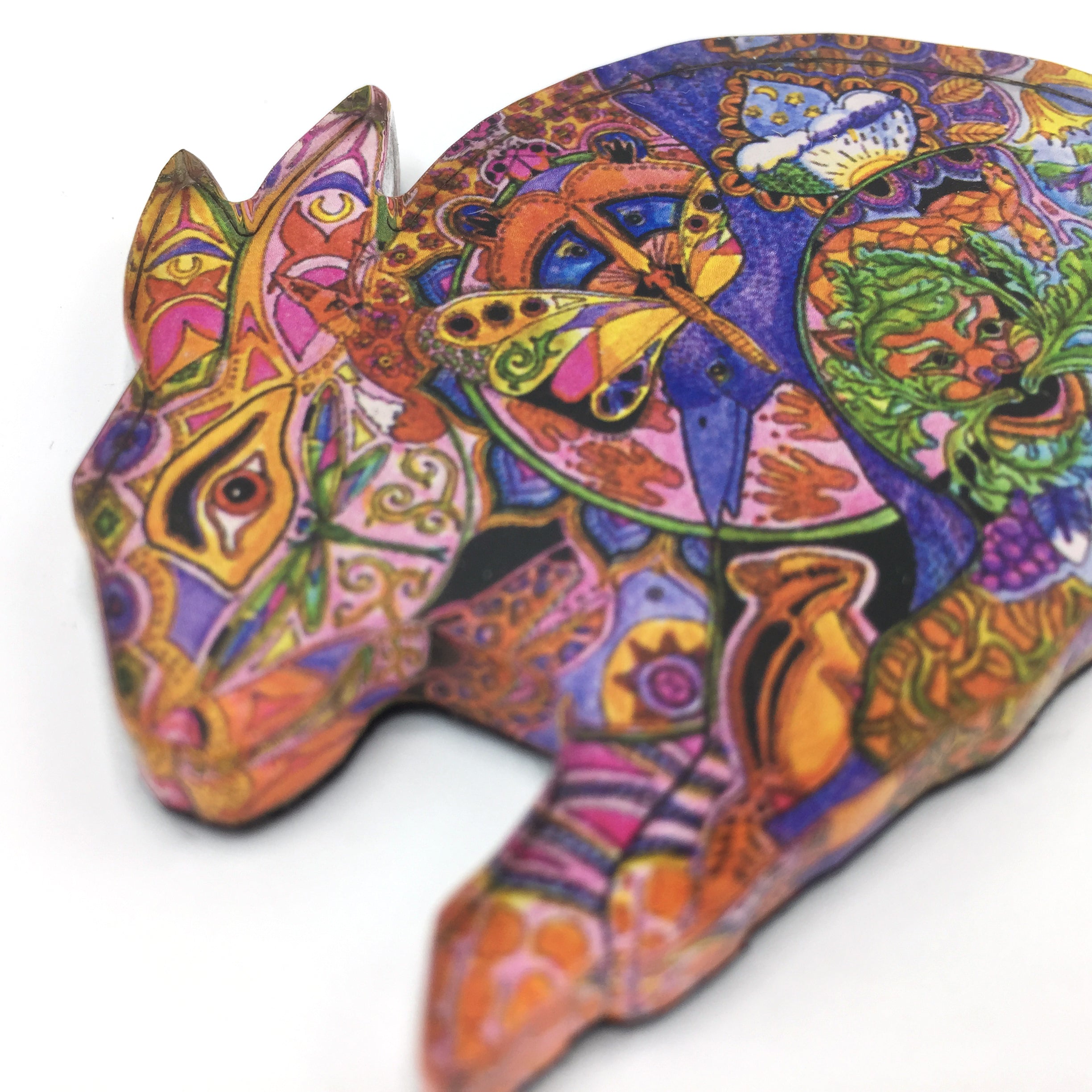 Before every piece, she researches the animal: its habitat, what threatens its survival, the delicate ecosystem keeping it alive. Then, working from the center outward, she hand-draws the interconnectedness – hidden animals, weather patterns, environmental symbols woven throughout each intricate design.