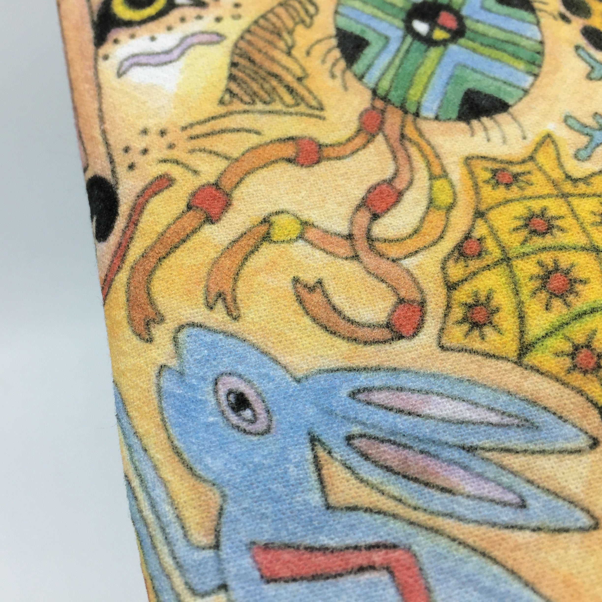 Before every piece, she researches the animal: its habitat, what threatens its survival, the delicate ecosystem keeping it alive. Then, working from the center outward, she hand-draws the interconnectedness – hidden animals, weather patterns, environmental symbols woven throughout each intricate design.