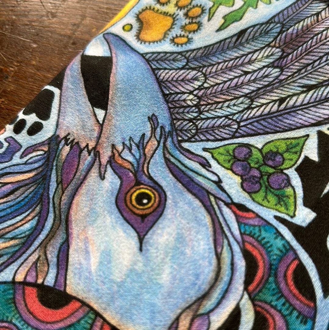 Before every piece, she researches the animal: its habitat, what threatens its survival, the delicate ecosystem keeping it alive. Then, working from the center outward, she hand-draws the interconnectedness – hidden animals, weather patterns, environmental symbols woven throughout each intricate design.