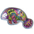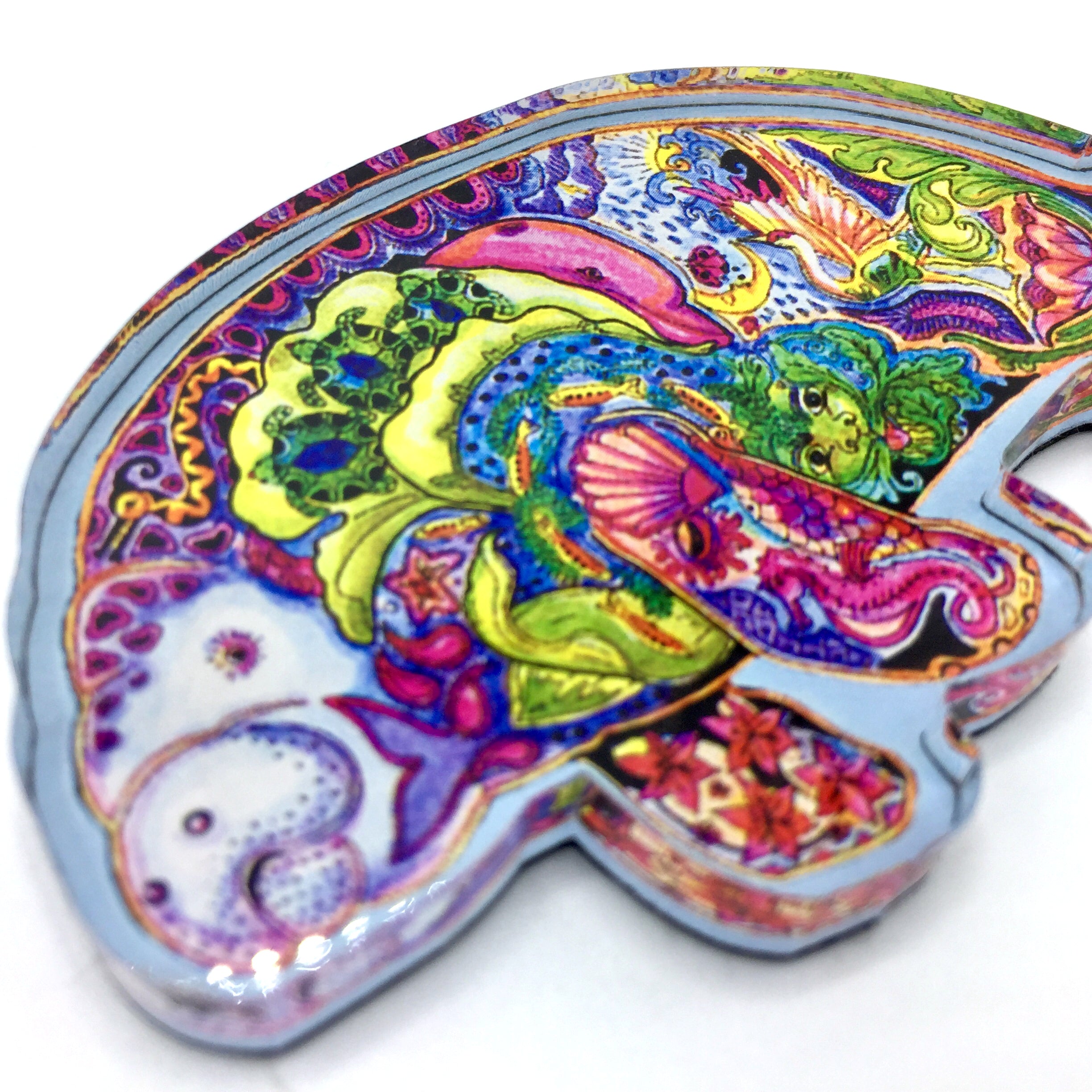 Before every piece, she researches the animal: its habitat, what threatens its survival, the delicate ecosystem keeping it alive. Then, working from the center outward, she hand-draws the interconnectedness – hidden animals, weather patterns, environmental symbols woven throughout each intricate design.