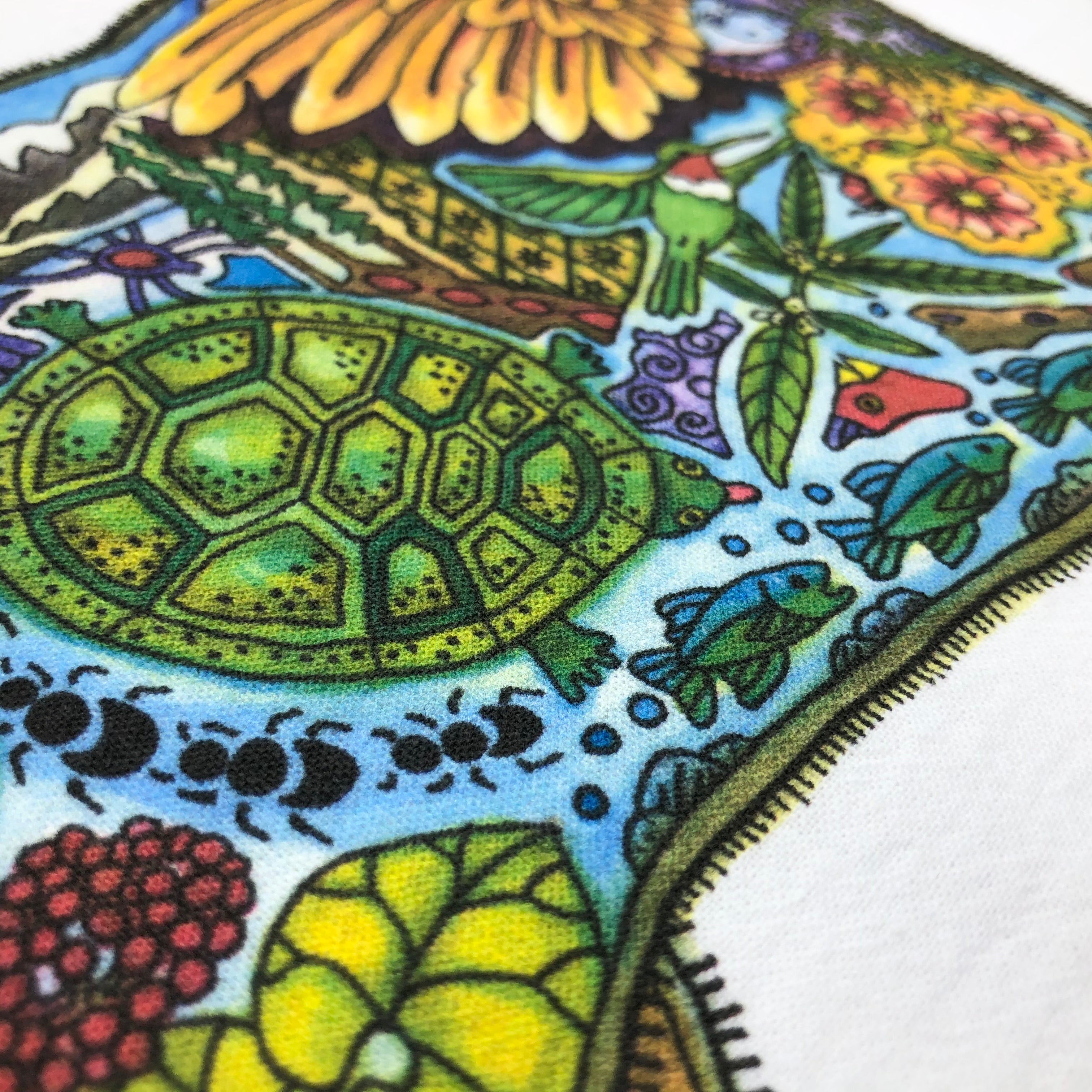 Before every piece, she researches the animal: its habitat, what threatens its survival, the delicate ecosystem keeping it alive. Then, working from the center outward, she hand-draws the interconnectedness – hidden animals, weather patterns, environmental symbols woven throughout each intricate design.
