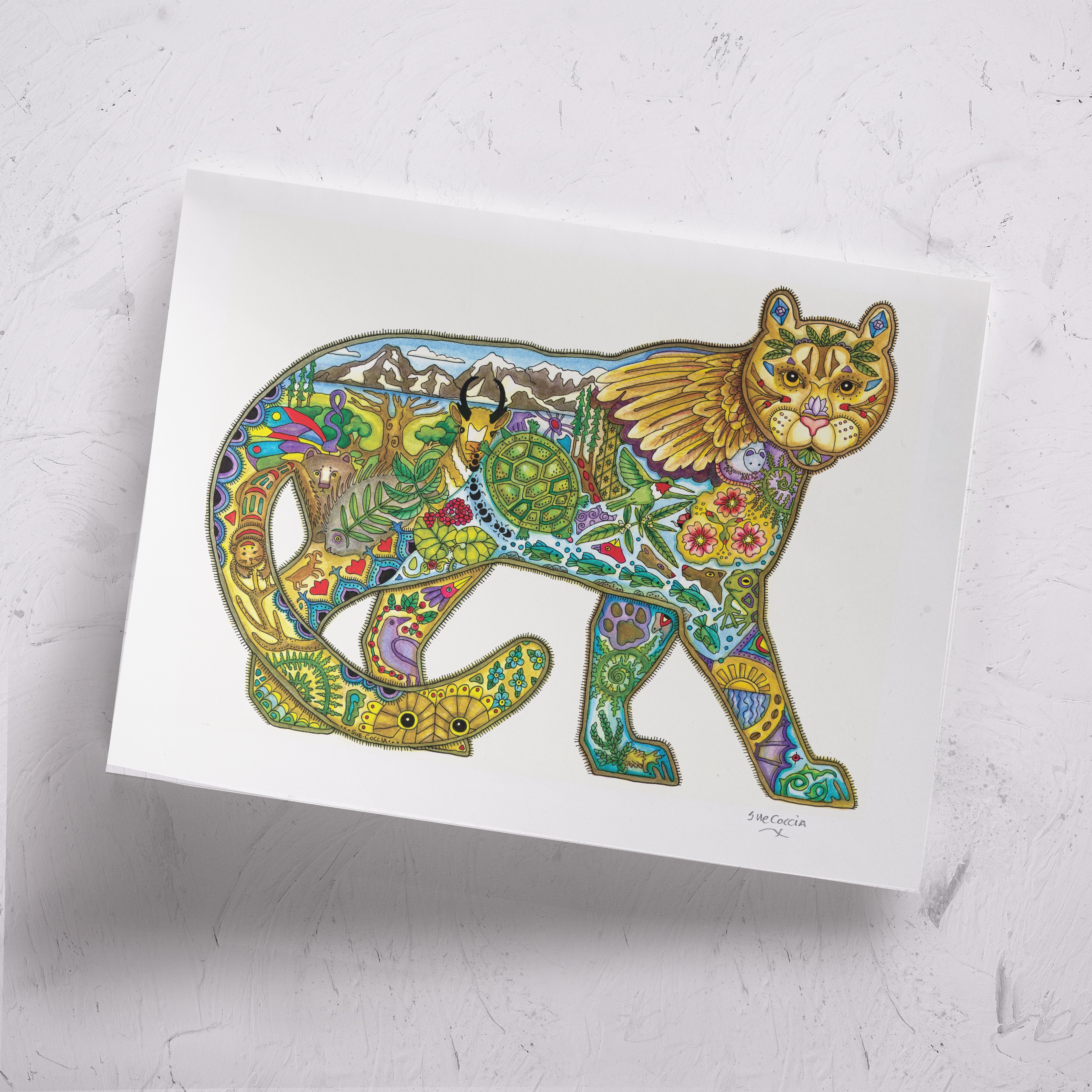 Before every piece, she researches the animal: its habitat, what threatens its survival, the delicate ecosystem keeping it alive. Then, working from the center outward, she hand-draws the interconnectedness – hidden animals, weather patterns, environmental symbols woven throughout each intricate design.