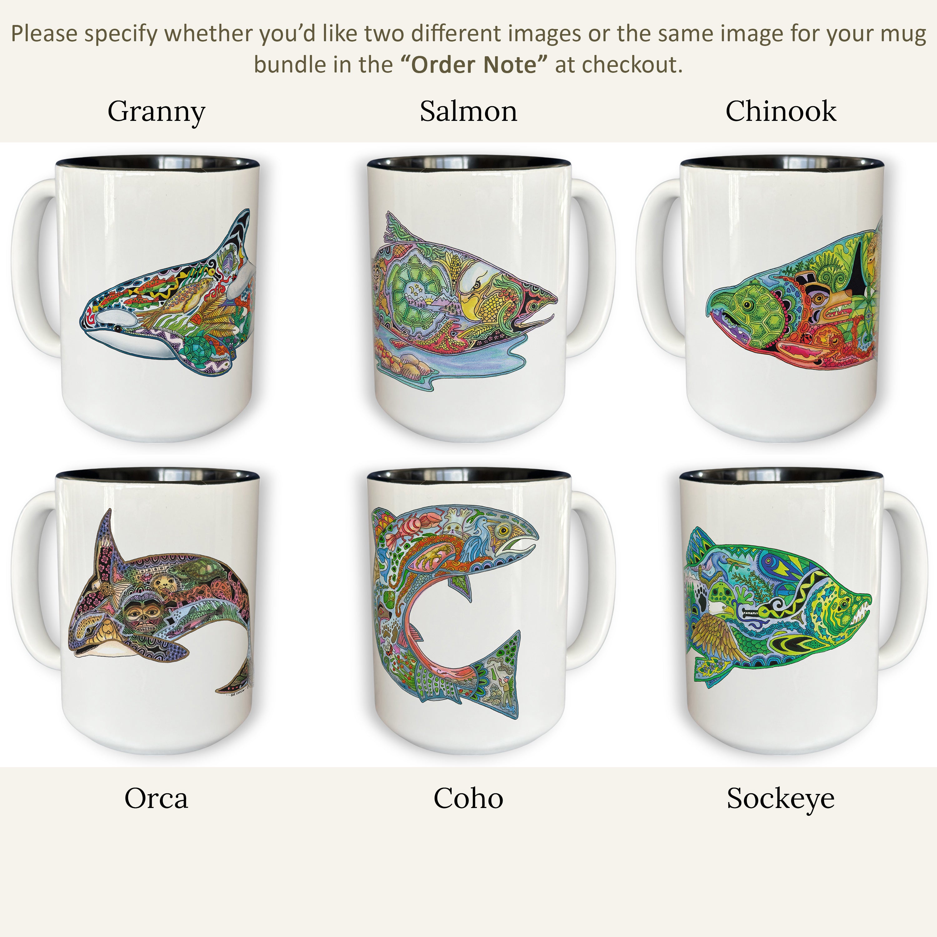 1 Cascadia Critters coloring book - 1 Chinook tea towel - 2 Mugs - 2 Coasters - 6 Pack of Stickers (Orcas/Salmon) - 1 Orca tote bag