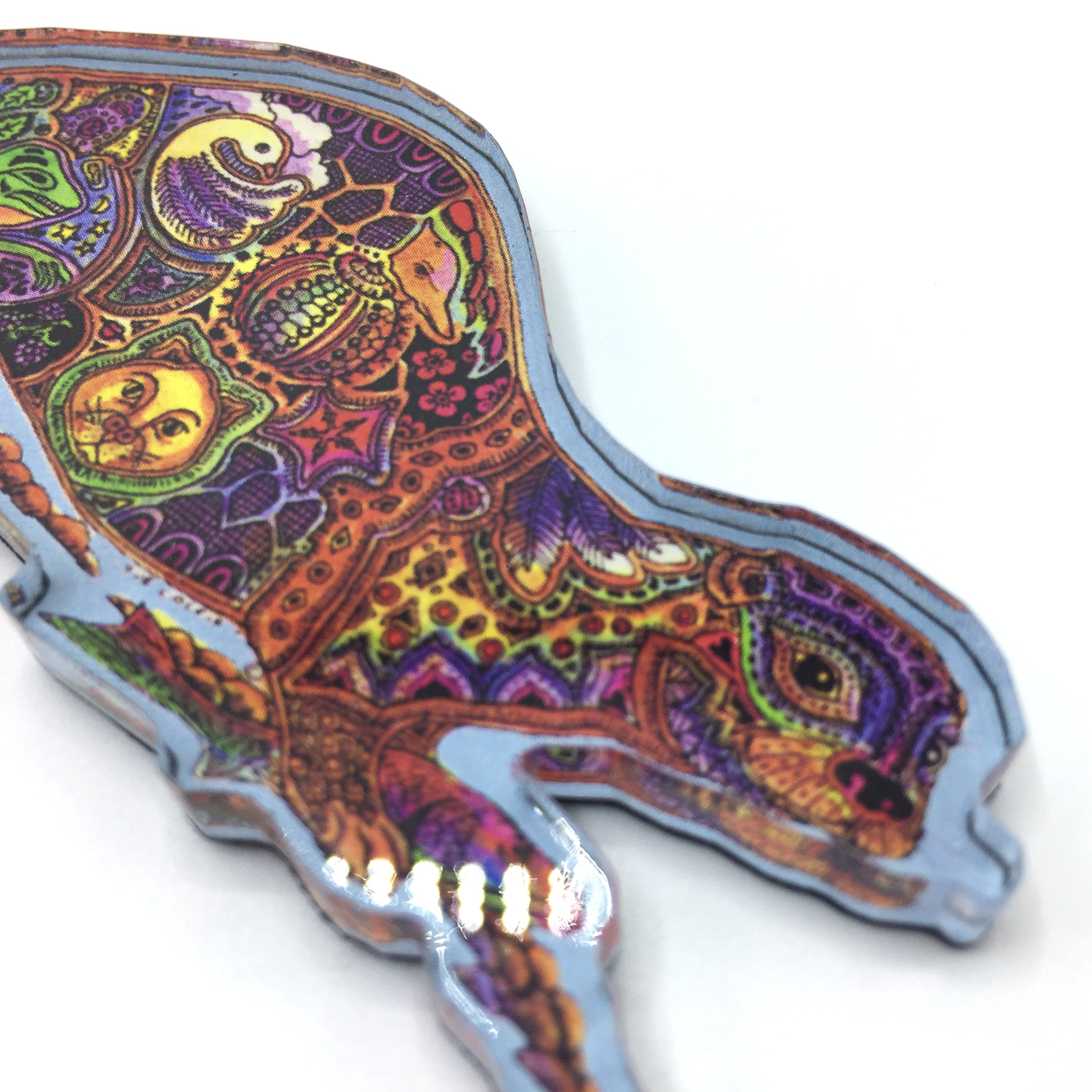 Before every piece, she researches the animal: its habitat, what threatens its survival, the delicate ecosystem keeping it alive. Then, working from the center outward, she hand-draws the interconnectedness – hidden animals, weather patterns, environmental symbols woven throughout each intricate design.