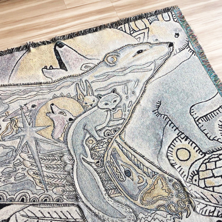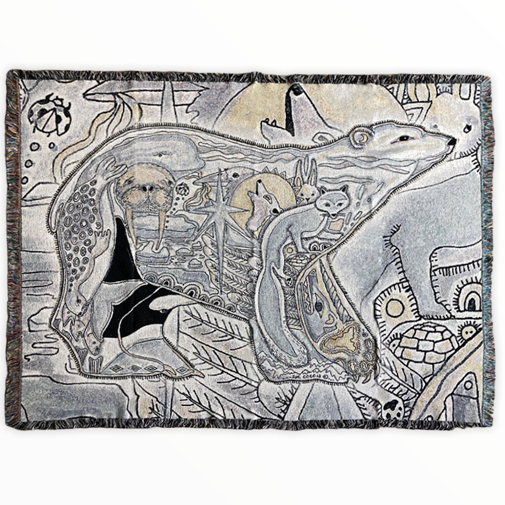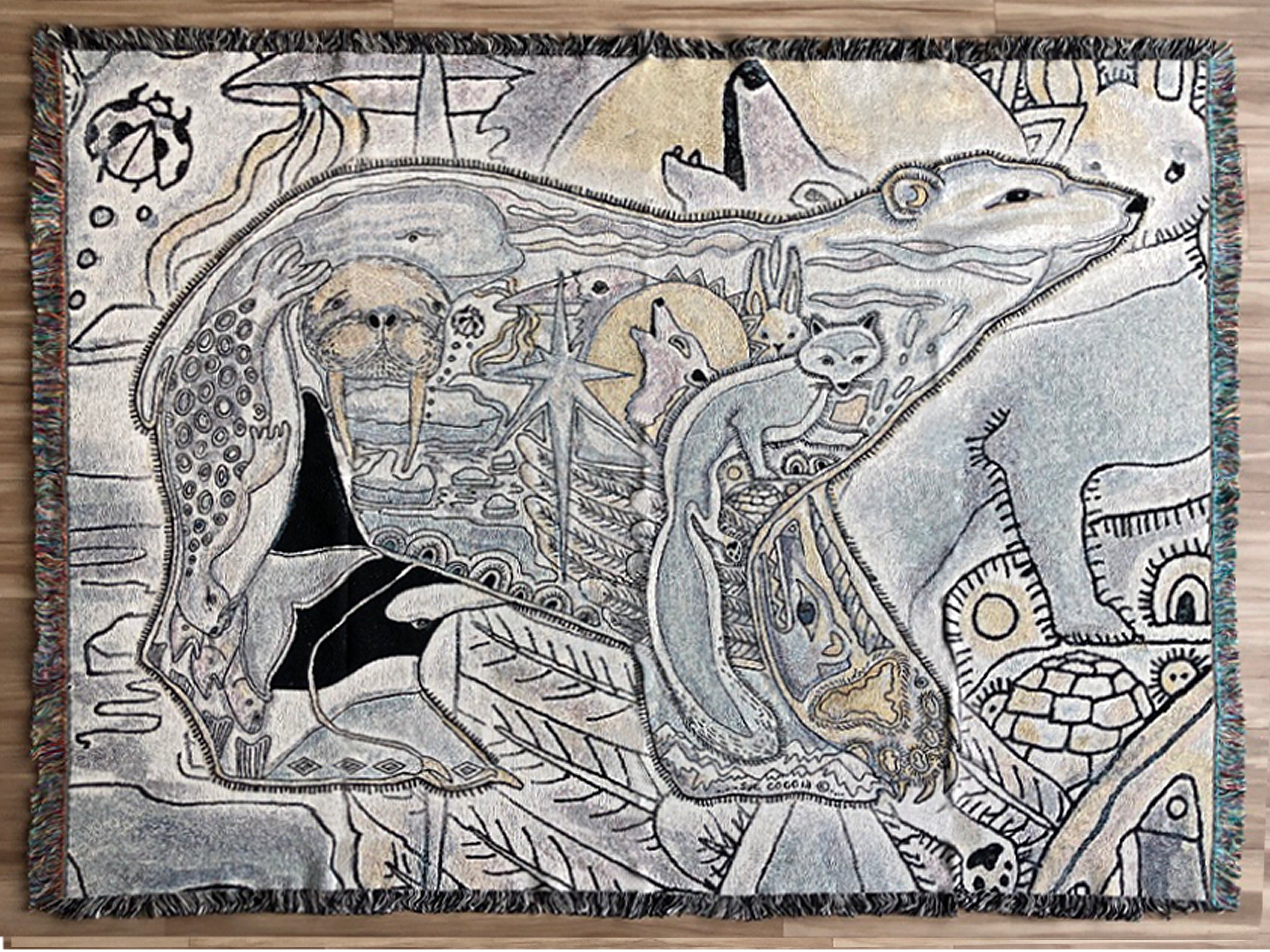 Before every piece, she researches the animal: its habitat, what threatens its survival, the delicate ecosystem keeping it alive. Then, working from the center outward, she hand-draws the interconnectedness – hidden animals, weather patterns, environmental symbols woven throughout each intricate design.