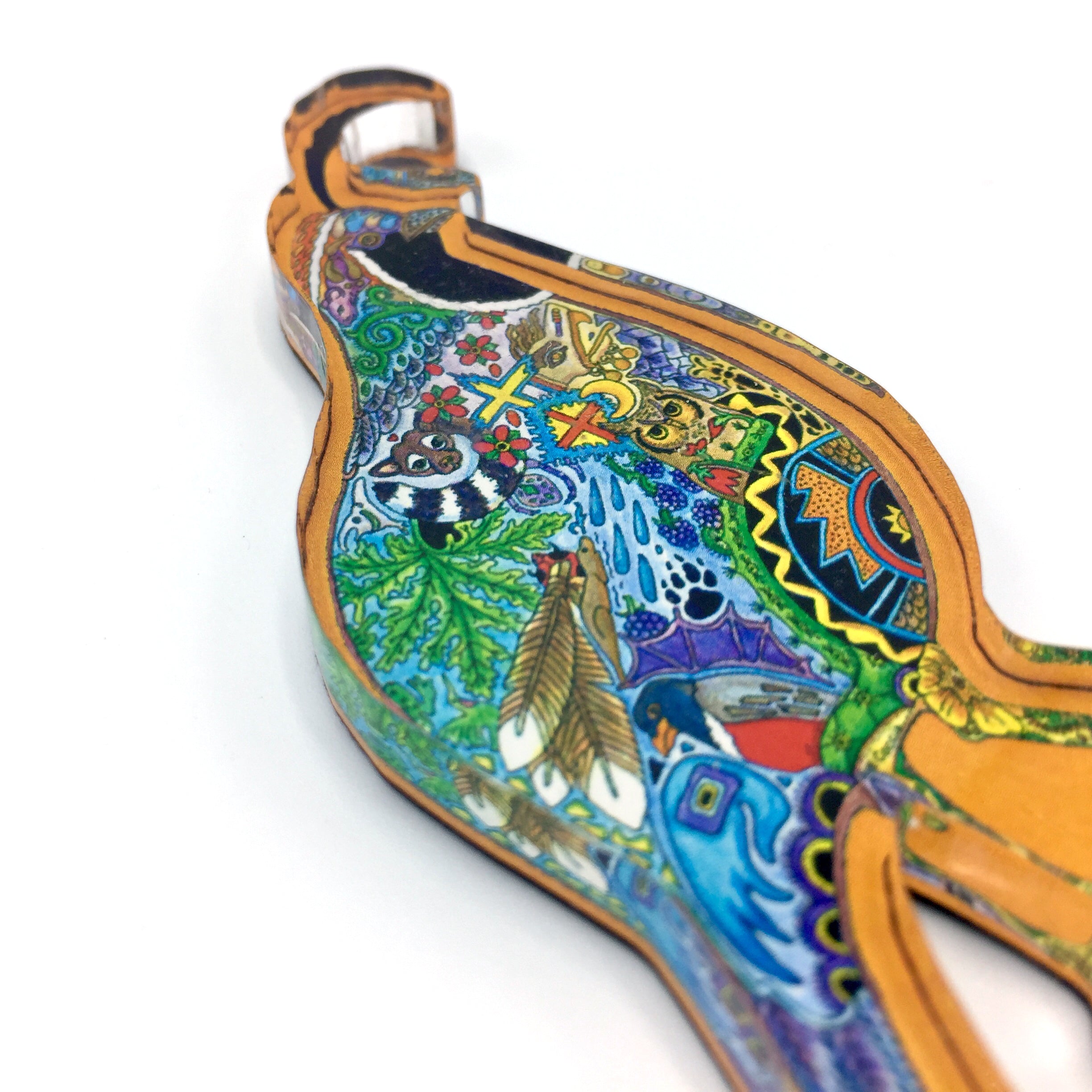 Before every piece, she researches the animal: its habitat, what threatens its survival, the delicate ecosystem keeping it alive. Then, working from the center outward, she hand-draws the interconnectedness – hidden animals, weather patterns, environmental symbols woven throughout each intricate design.