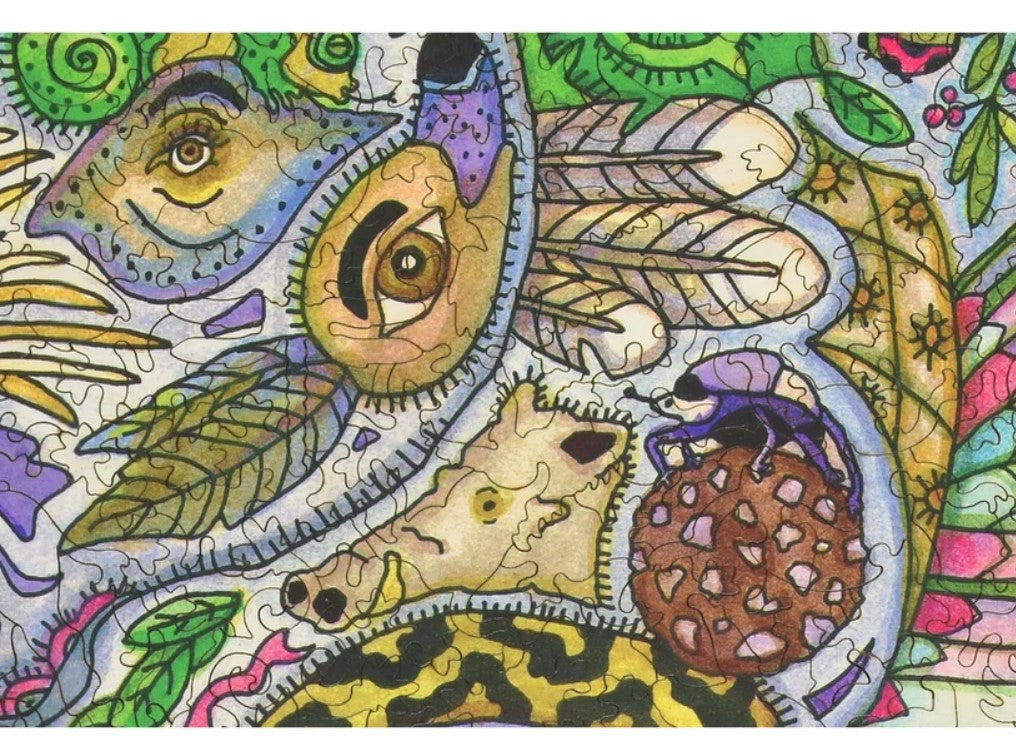 Before every piece, she researches the animal: its habitat, what threatens its survival, the delicate ecosystem keeping it alive. Then, working from the center outward, she hand-draws the interconnectedness – hidden animals, weather patterns, environmental symbols woven throughout each intricate design.
