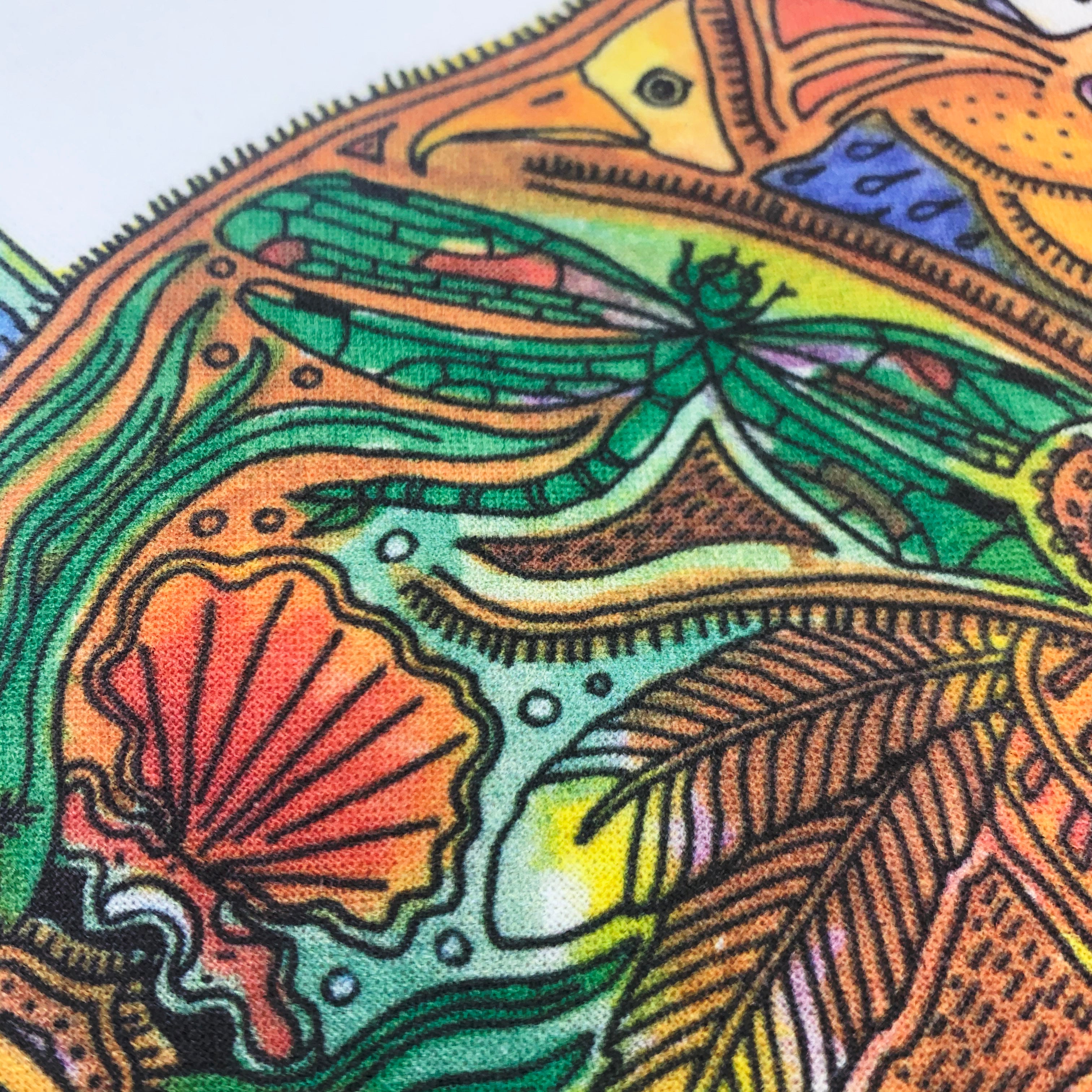 Before every piece, she researches the animal: its habitat, what threatens its survival, the delicate ecosystem keeping it alive. Then, working from the center outward, she hand-draws the interconnectedness – hidden animals, weather patterns, environmental symbols woven throughout each intricate design.