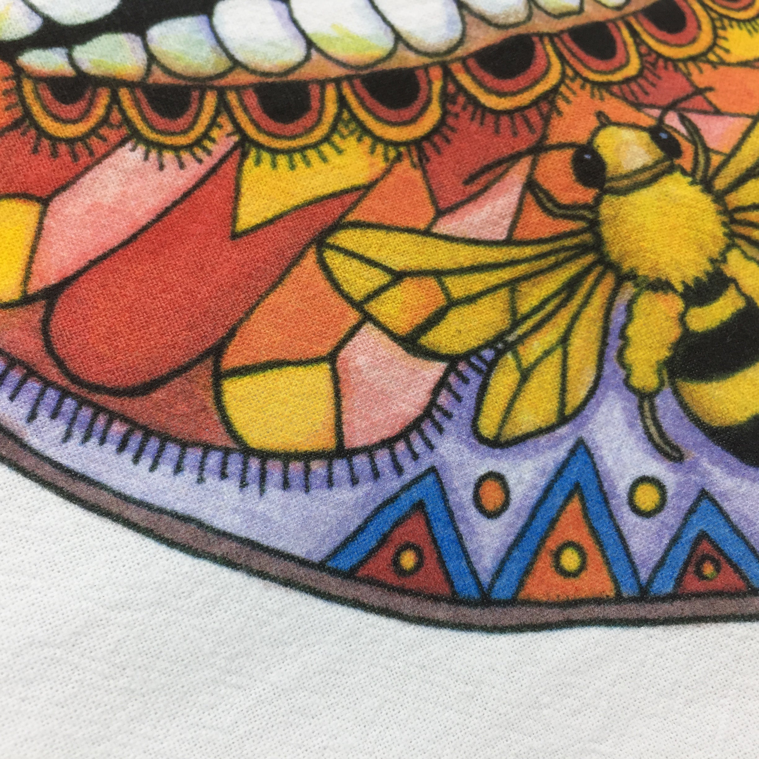 Before every piece, she researches the animal: its habitat, what threatens its survival, the delicate ecosystem keeping it alive. Then, working from the center outward, she hand-draws the interconnectedness – hidden animals, weather patterns, environmental symbols woven throughout each intricate design.