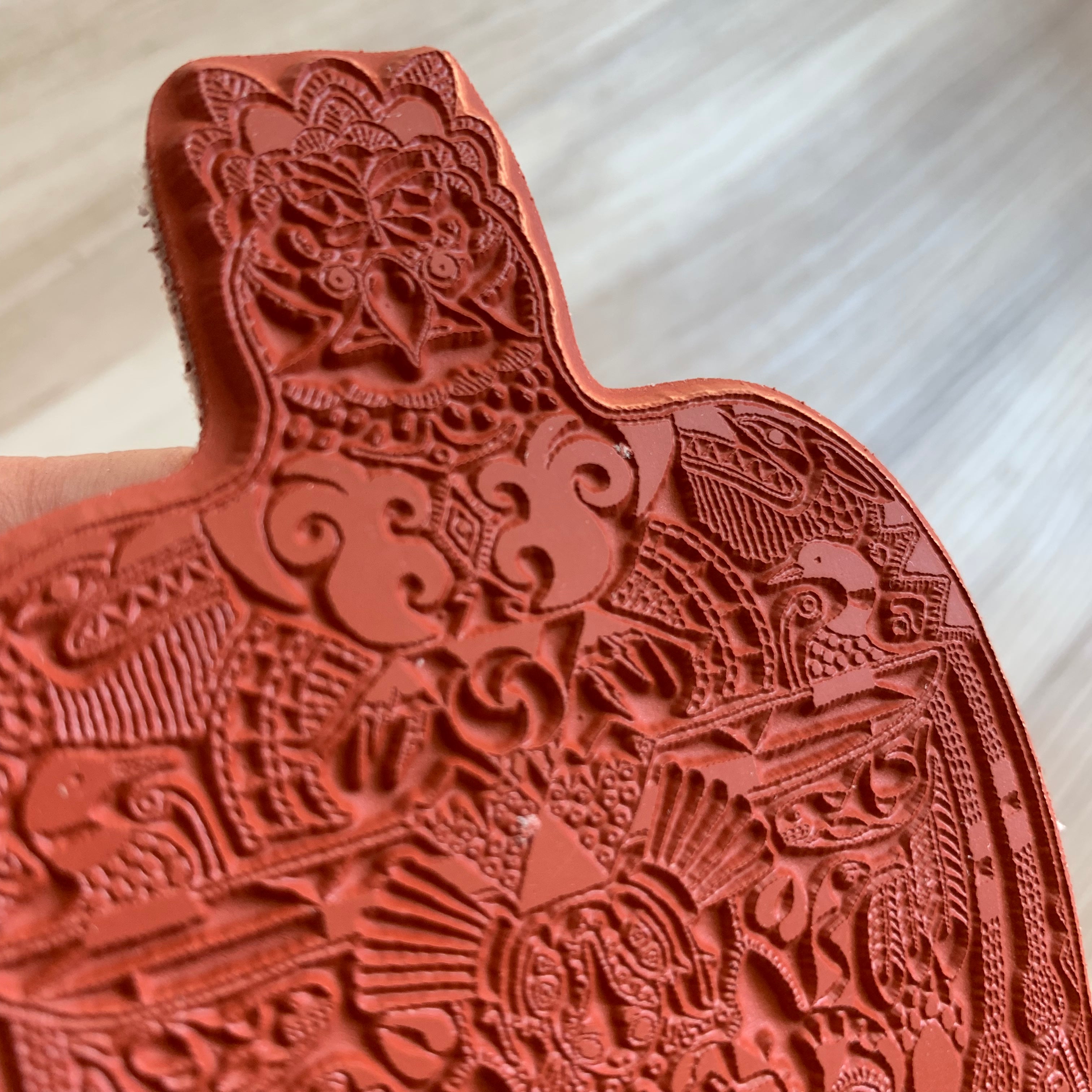 Before every piece, she researches the animal: its habitat, what threatens its survival, the delicate ecosystem keeping it alive. Then, working from the center outward, she hand-draws the interconnectedness – hidden animals, weather patterns, environmental symbols woven throughout each intricate design.