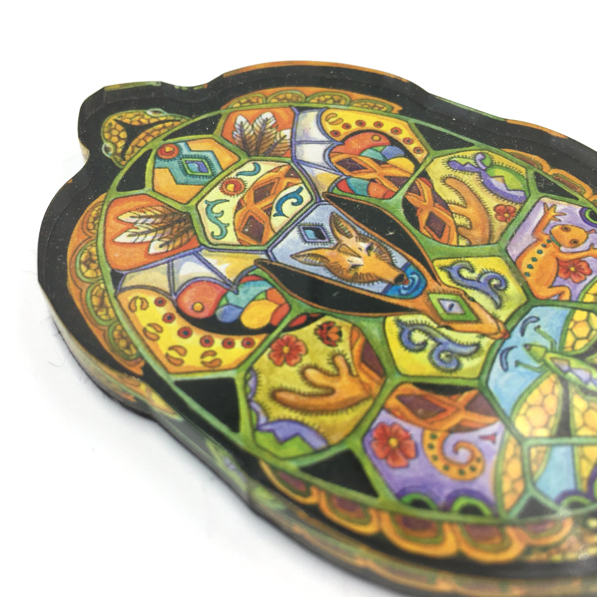 Before every piece, she researches the animal: its habitat, what threatens its survival, the delicate ecosystem keeping it alive. Then, working from the center outward, she hand-draws the interconnectedness – hidden animals, weather patterns, environmental symbols woven throughout each intricate design.