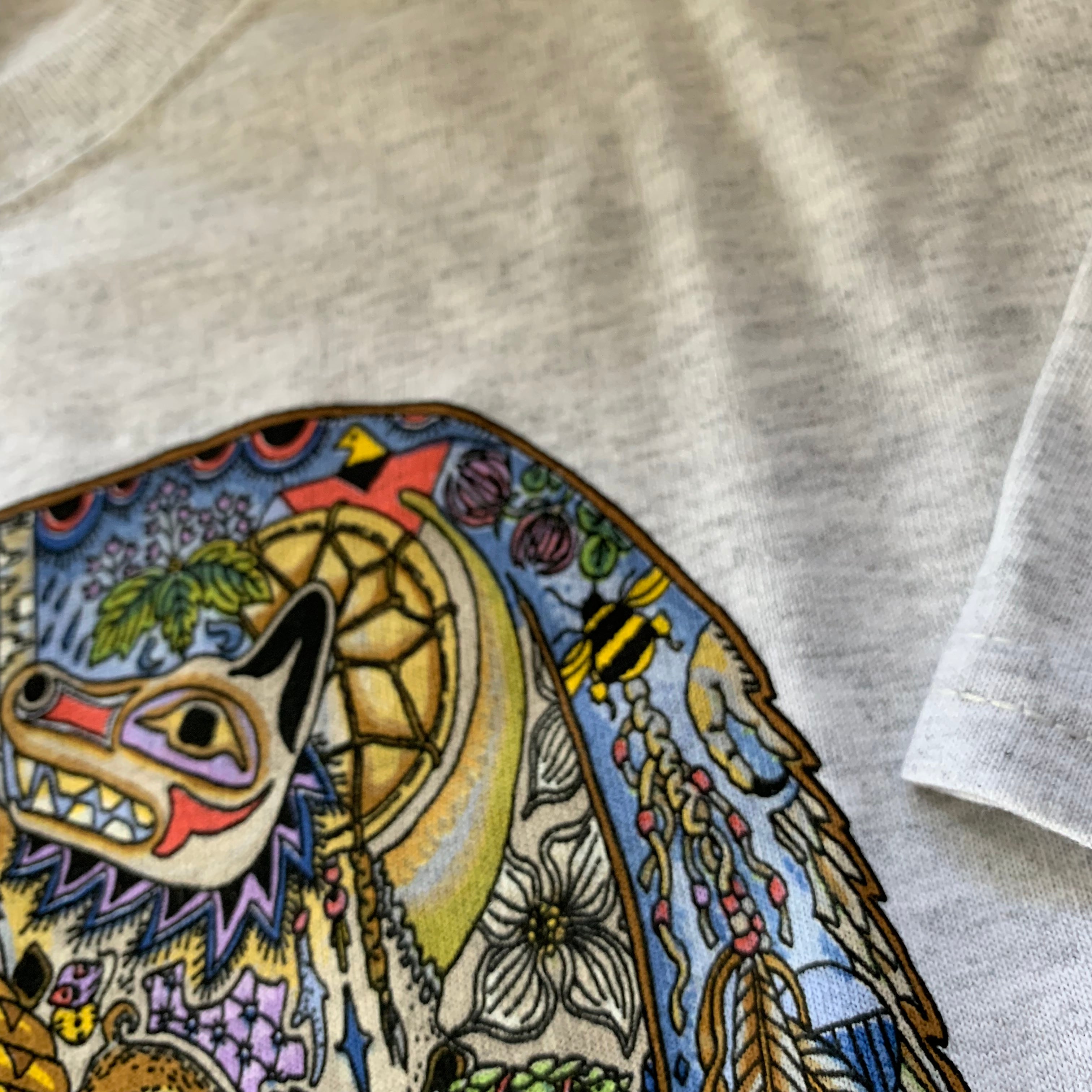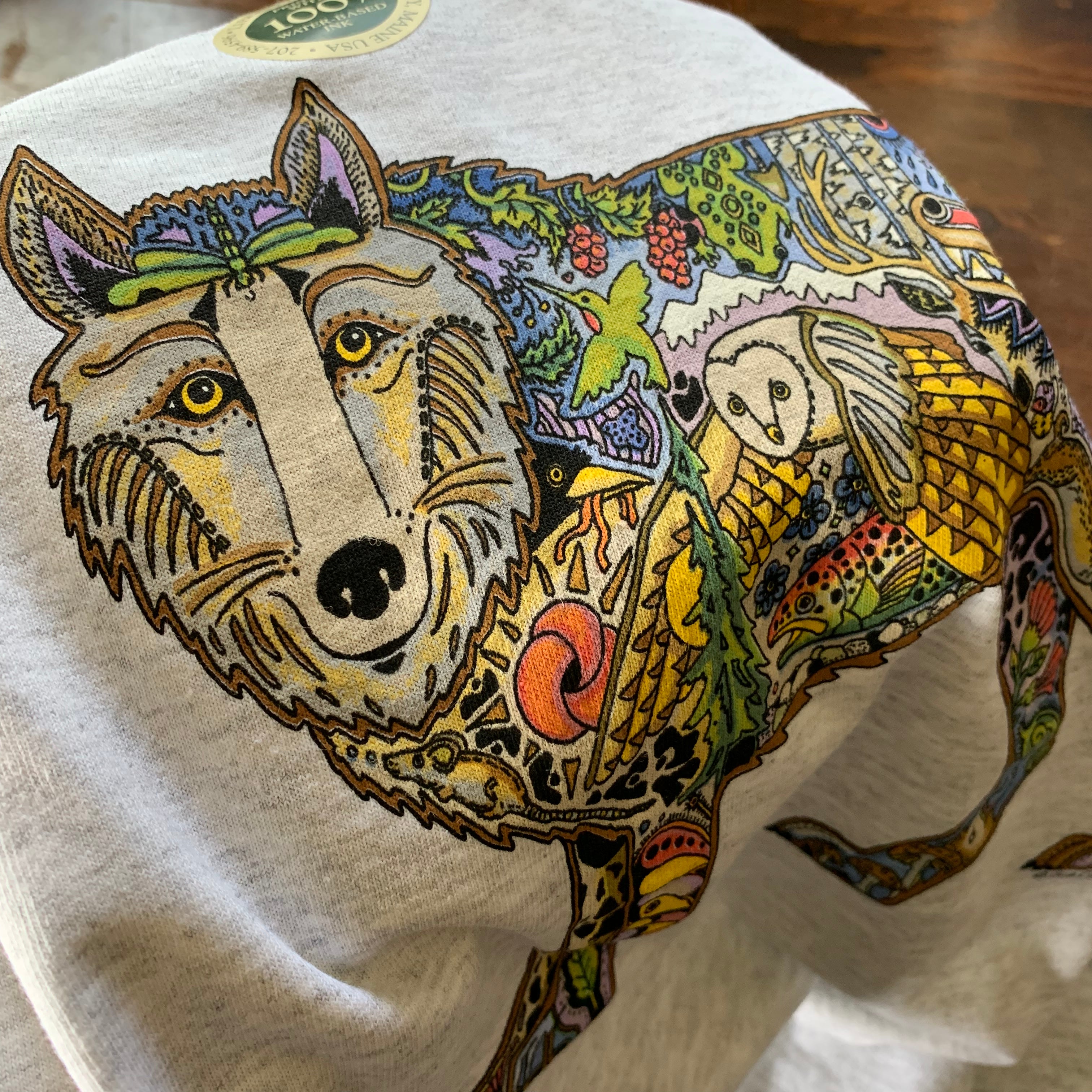 Before every piece, she researches the animal: its habitat, what threatens its survival, the delicate ecosystem keeping it alive. Then, working from the center outward, she hand-draws the interconnectedness – hidden animals, weather patterns, environmental symbols woven throughout each intricate design.